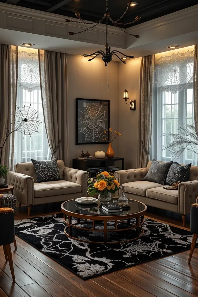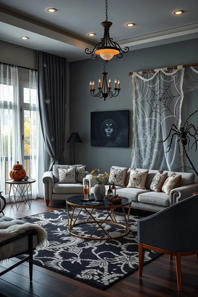 I prefer to use a black and silver spider web rug as the centerpiece and put some geometric furniture around it and use minimal accessories. Embroidered cobweb pillows, black lace table runners, or glass vases with wire cobweb wrapping are just a few things that can help to tie the theme together. Even the slightest webbed fabrics on curtains can make the room look hauntingly soft.