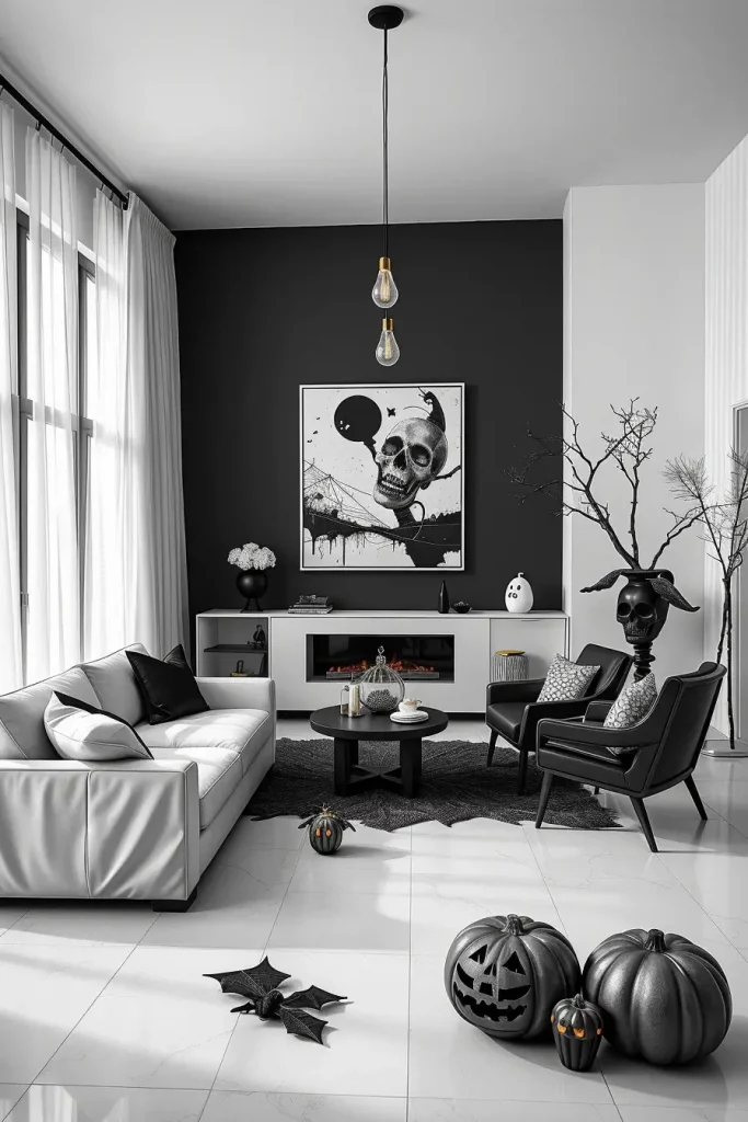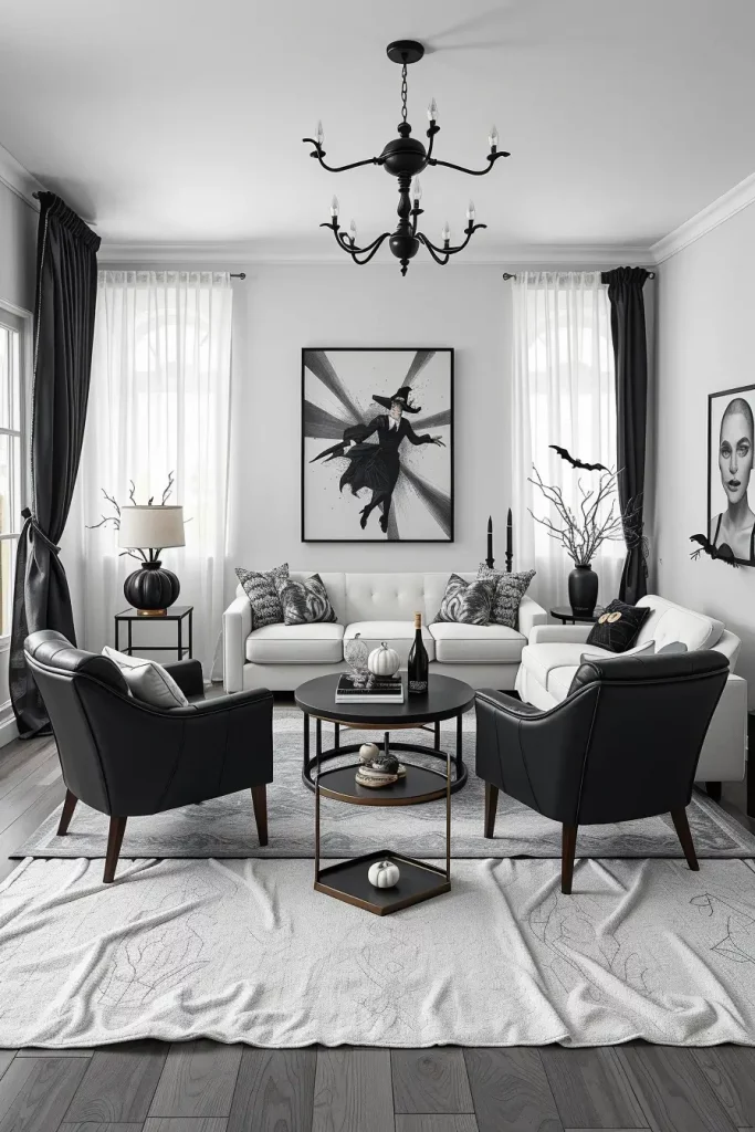 I prefer to add a white linen sectional that is contrasted with black leather accent chairs or a black marble coffee table. The black-framed ghostly silhouettes with sheer white curtains create the effect of haunted elegance. Monochrome throw blankets and abstract black-and-white area rugs should be used to make the space grounded.