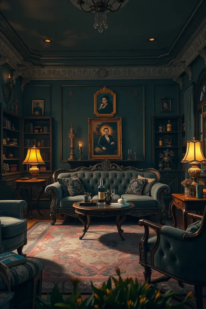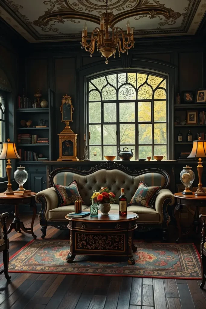 I start with a big Victorian-style sofa, and then I add some weathered wood side tables and a tufted bench or ottoman. I prefer to use wrought iron or distressed wood finishes on shelving, and I decorate it with old books, potion bottles, and old clocks. Frames are distressed, mirrors are arched, drapes are heavy. Asymmetrical or semi-circular furniture arrangement to look like the old parlor designs.