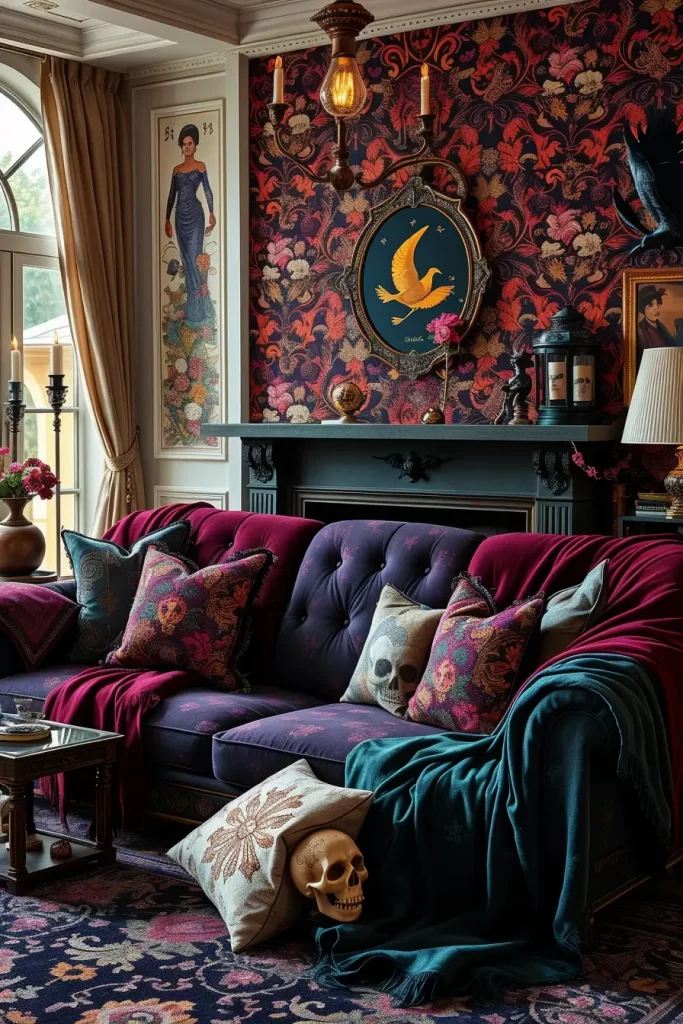 You can also change your living room without a major redesign by simply changing some of the soft furnishings that you have seasonally. I prefer to use Halloween throw pillows and blankets with a Gothic living room style, which is dark and has a lot of embroidery and textural diversity. By 2025, the fashion is shifting towards a more luxurious, spooky elegance instead of novelty prints.