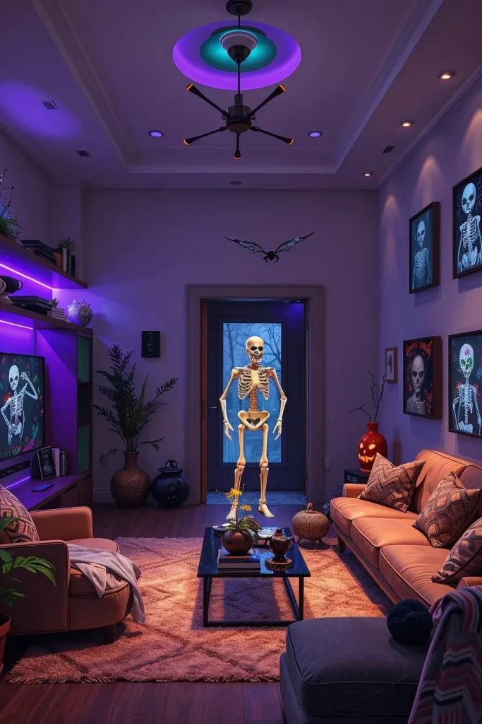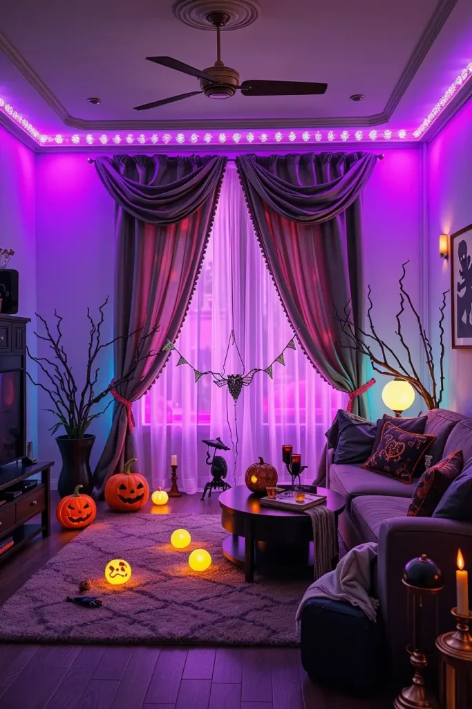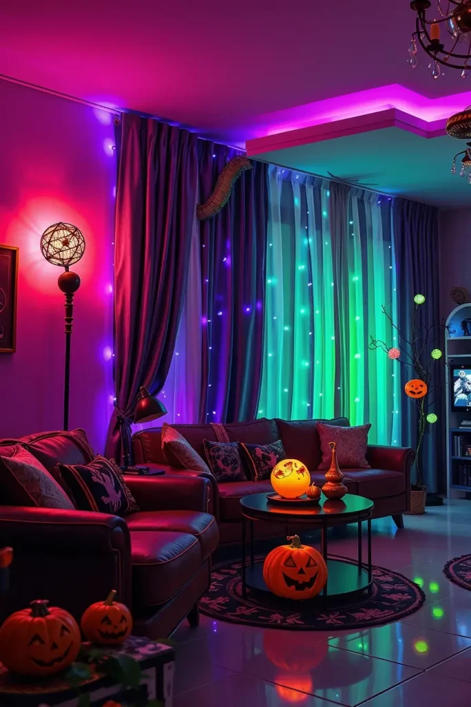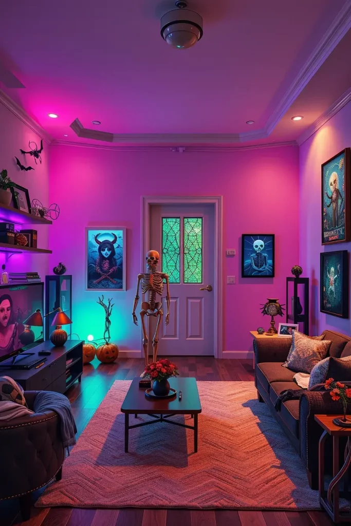 One of the most underrated elements of Halloween interior design is lighting, which is the most transformative. By 2025, LED lighting that changes color has become the centerpiece. I always suggest putting LED strips behind the TV, under the couch, or along the ceiling molding to cast the room in creepy colors, purples, oranges, even ghostly green.