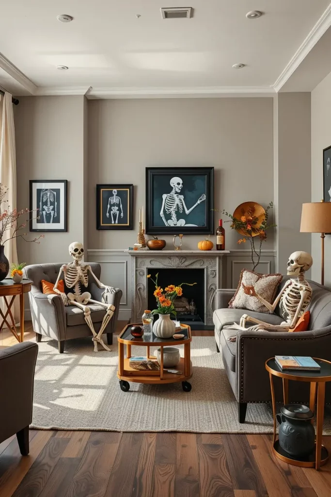 I keep the backgrounds neutral, grays, taupes, blacks, so that the white or ivory skeletons stand out without conflicting. Provide accessories such as miniature top hats, sunglasses or even bow ties to make them more human. In smaller rooms, skeletal hand wall sconces or framed X-ray prints are good accent pieces that do not overpower the room.
