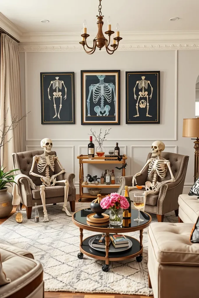 Skeleton decor is usually viewed as childish or cute, but in 2025, it is being redesigned in an artistic and modern way. I have placed life-sized skeletons in stylish accent chairs, at bar carts, or around coffee tables to bring some personality and humor to a living room.