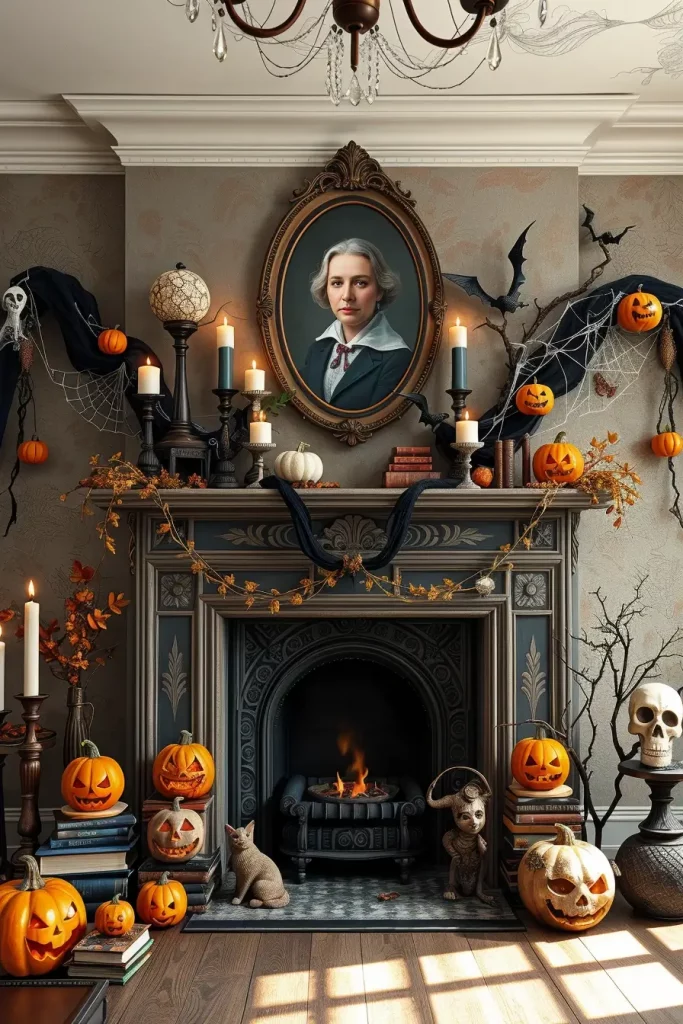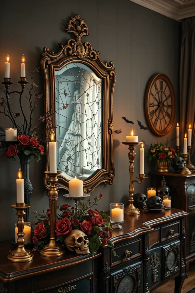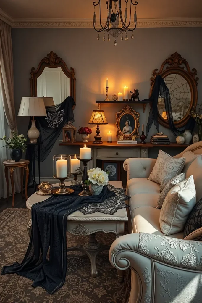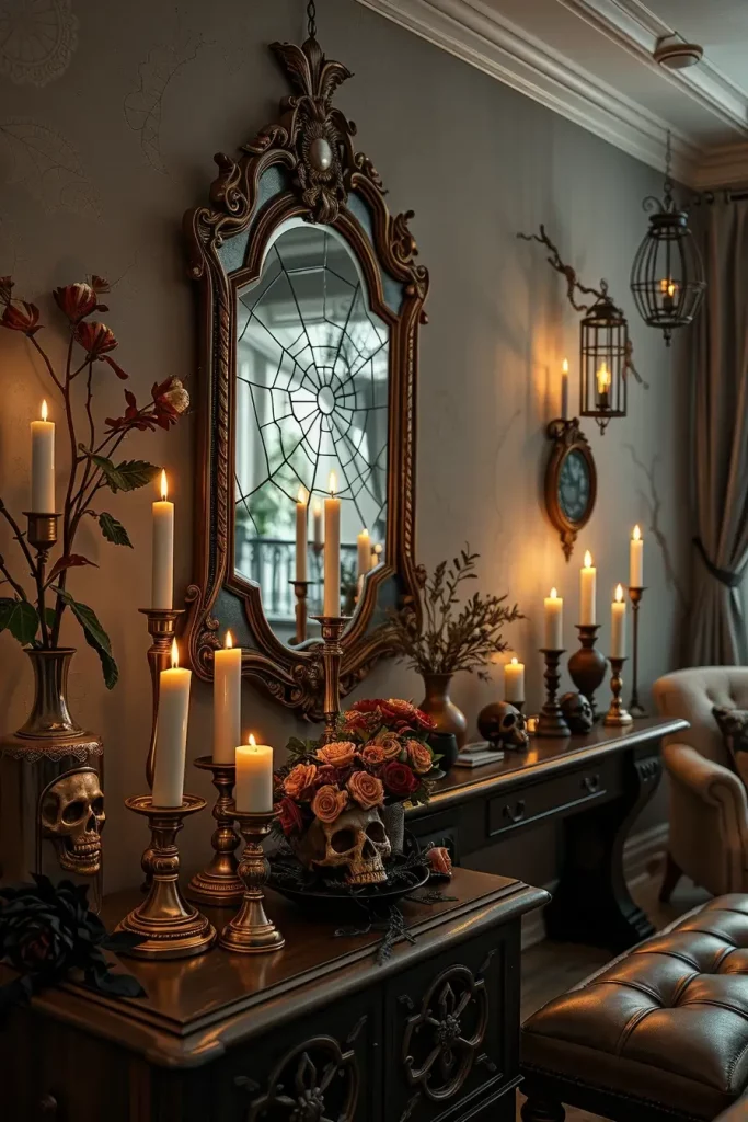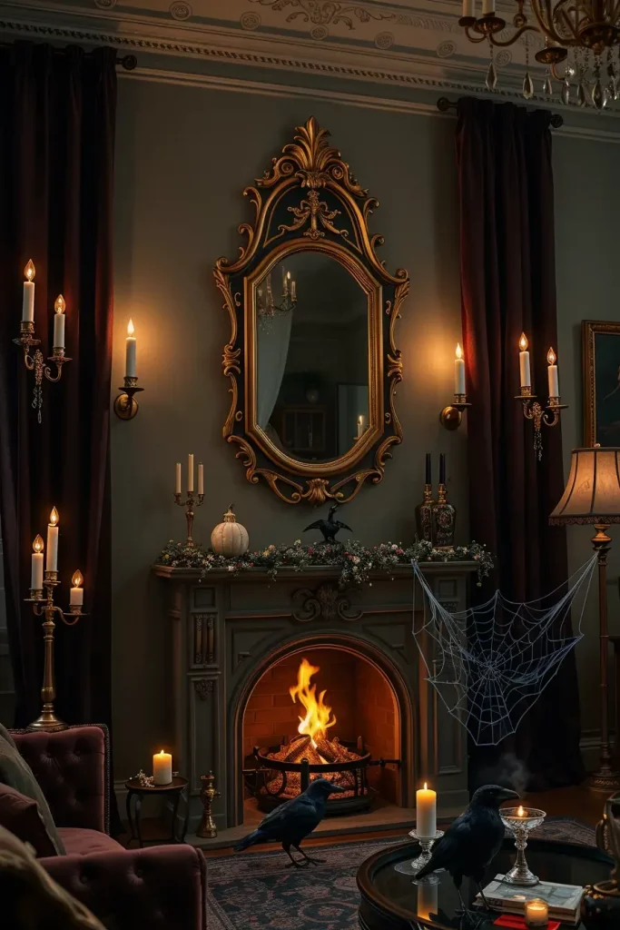 One of the most fascinating Halloween decor items that I have is a vintage-style mirror with a smoky or distressed finish. These mirrors give an illusion of ghostly presence without dominating the space. They immediately make the living room decor look like a haunted mansion-dark but still classy I suggest hanging them over the fireplace or in front of a window to reflect the candlelight in the room, to darken the shadows.