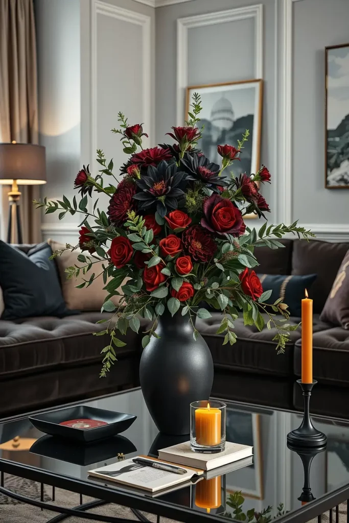 This year, Halloween flower arrangements are going more to the dark, dramatic, sophisticated side. The coffee table is always my first point to decorate in Halloween and a floral centerpiece is the most striking one. Deep burgundy, black dahlias, midnight roses, and dusty eucalyptus branches add the seasonal spookiness in a lush and upscale manner.