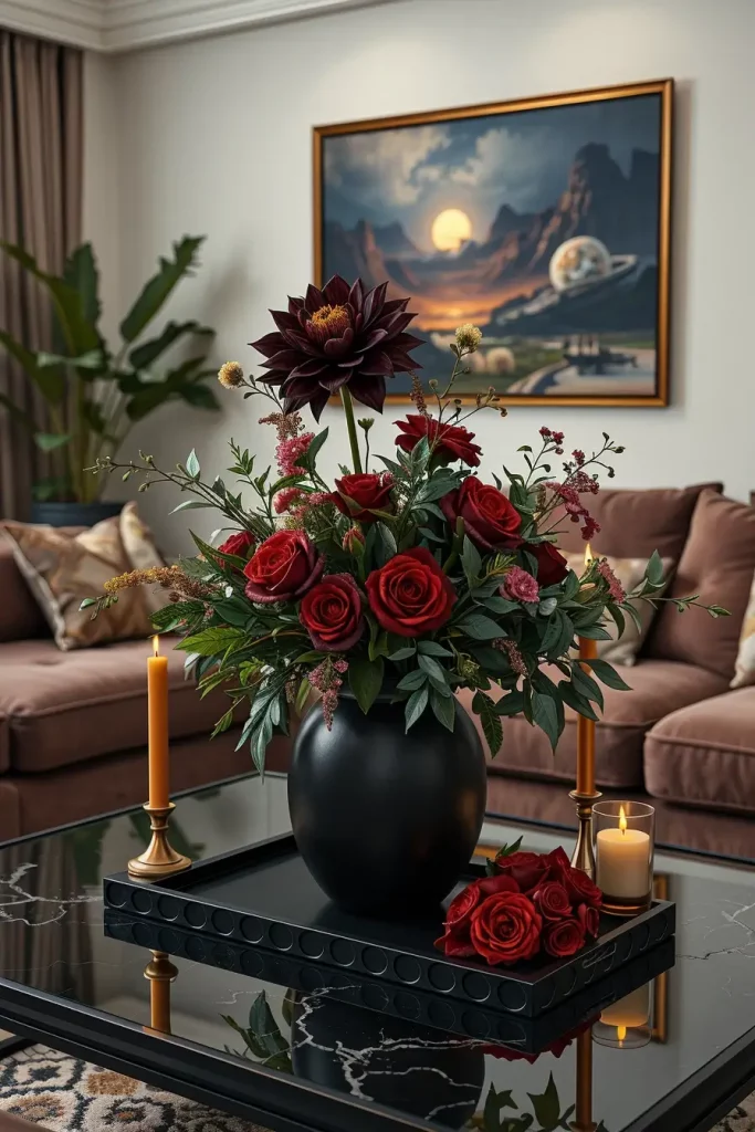Personally, I have used these arrangements not only during Halloween but also during the fall. They offer a down-to-earth sophistication that will substitute regular pumpkins or jack-o-lanterns. The dark floral trend is also a crossover between gothic and cottagecore aesthetics, which is why it is perfectly suited to 2025 living rooms.