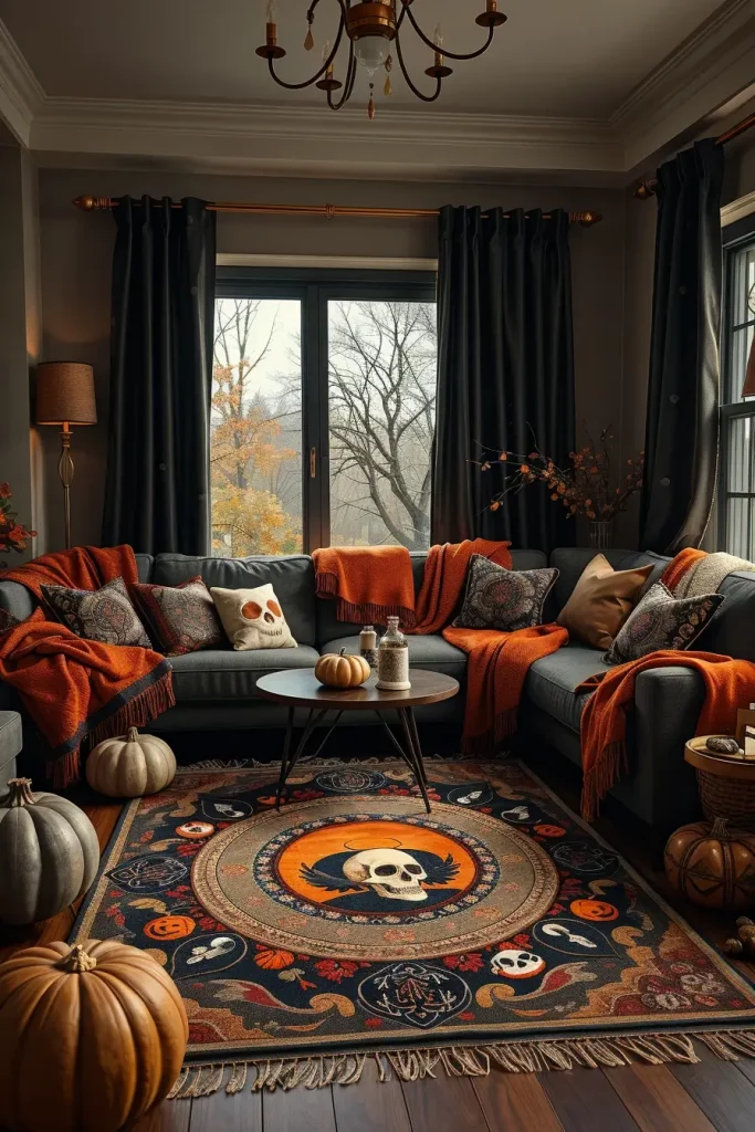 One of the easiest and most effective things you can do is to change your rugs and textiles with the season. In Halloween living room decor ideas 2025, a trending decoration is area rugs with bold designs such as spiderwebs, moths, or baroque filigree in orange, black, or deep plum. These materials make the space and give a visual base to operate on.