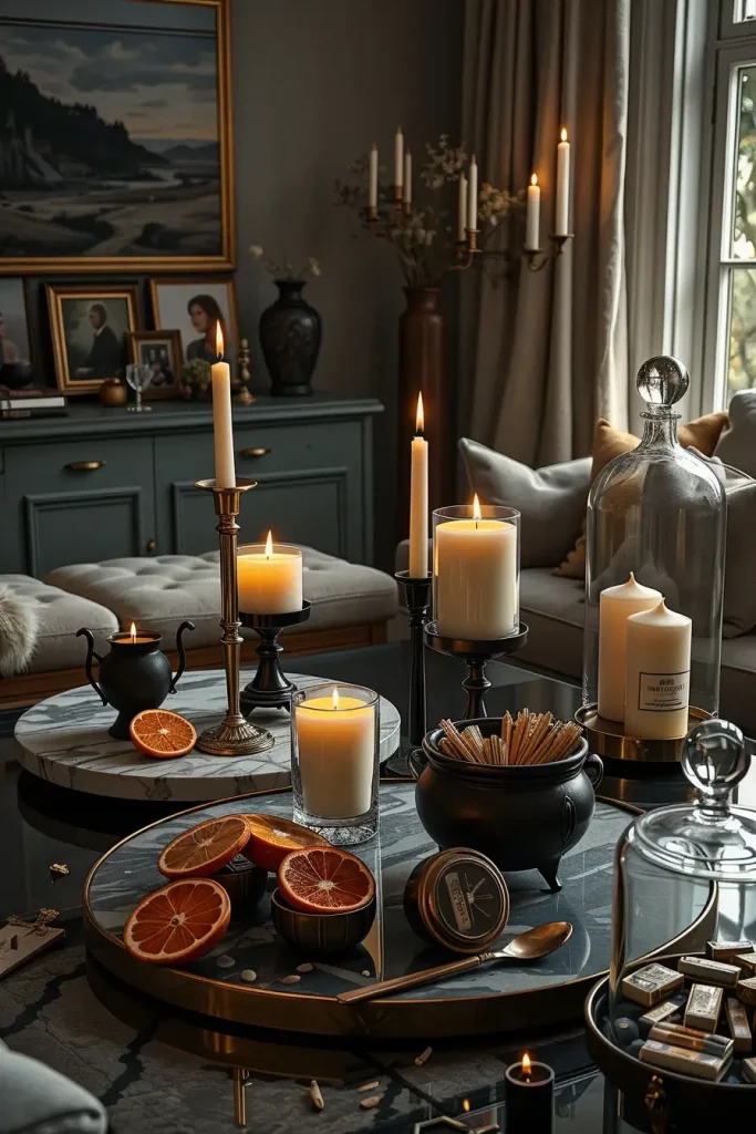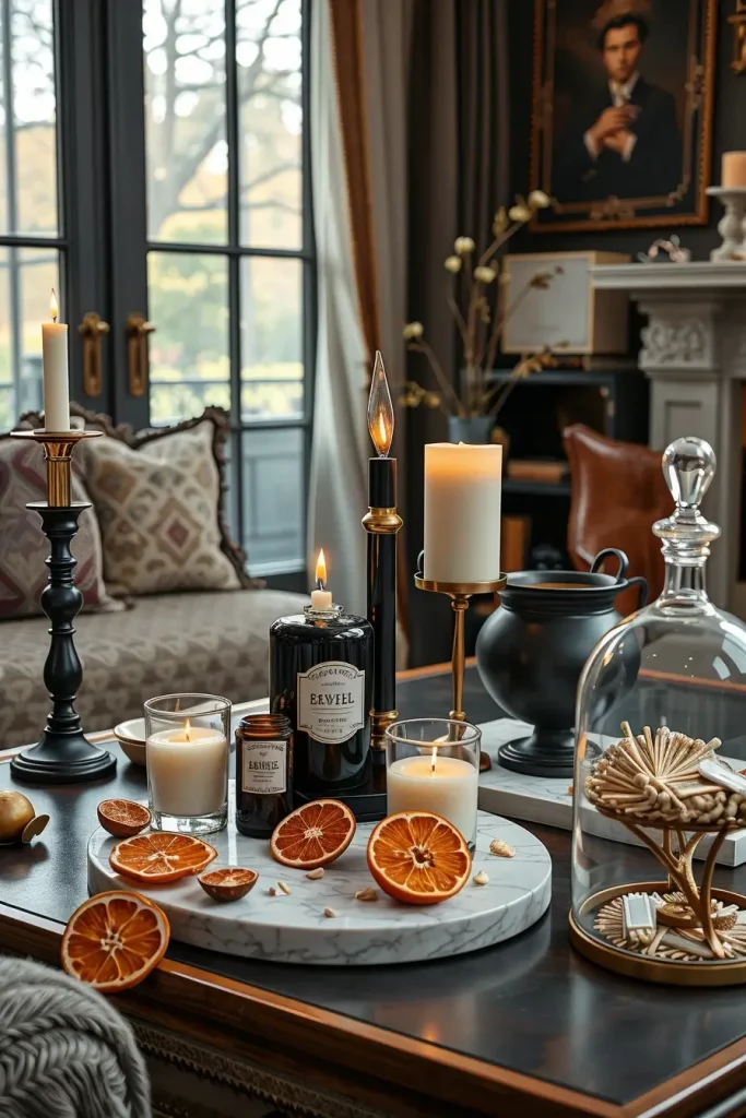 Atmosphere is not only a visual thing, but also it has smell. Aroma is one of the most powerful Halloween living room decor items. In 2025, moody candle displays will be moving beyond basic pumpkin spice and into oud, smoke, leather, and clove. I have tiered trays or marble risers to place the different types of candles at different levels to create depth.