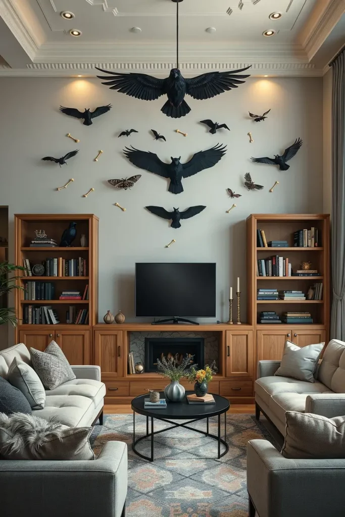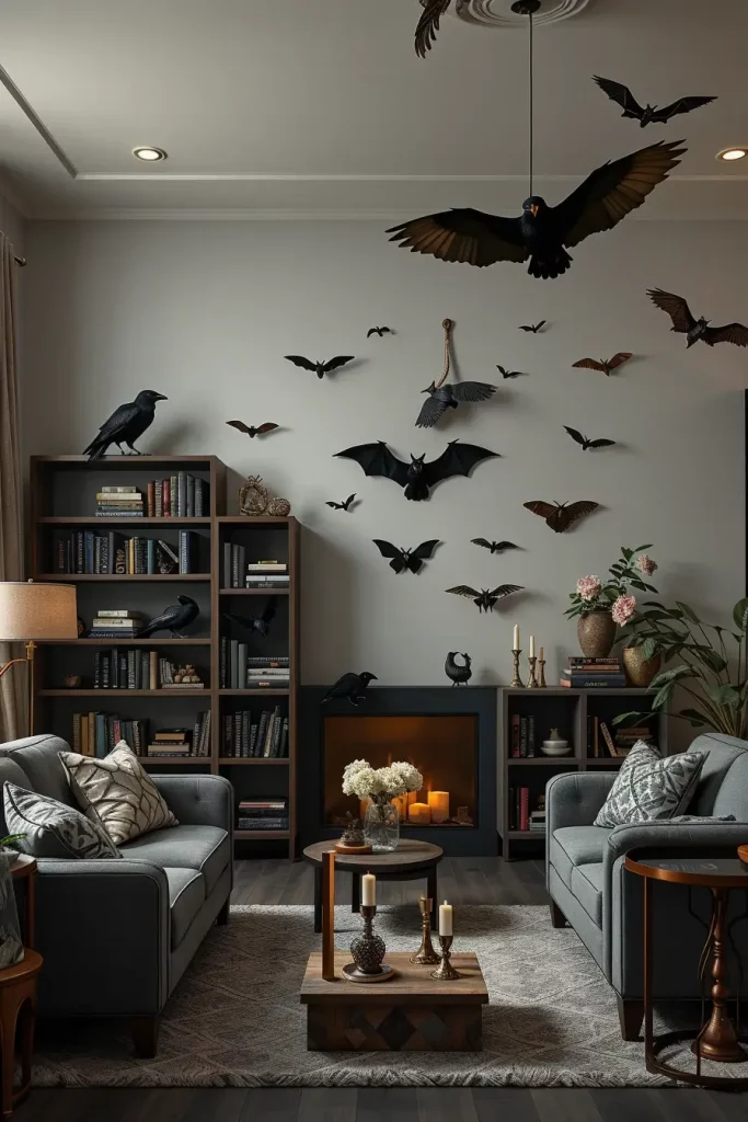 One of my favorite Halloween decorations is to include critters such as bats and crows into my Halloween living room decorations, without making it a haunted house. In 2025, it is the trend of subtlety. I would rather use small groups of such animals in natural positions instead of cartoonish or exaggerated ones. Positioning them strategically, on curtain rods, on top of bookshelves, or in mid-air on the wall gives them a touch of realism and mystery.