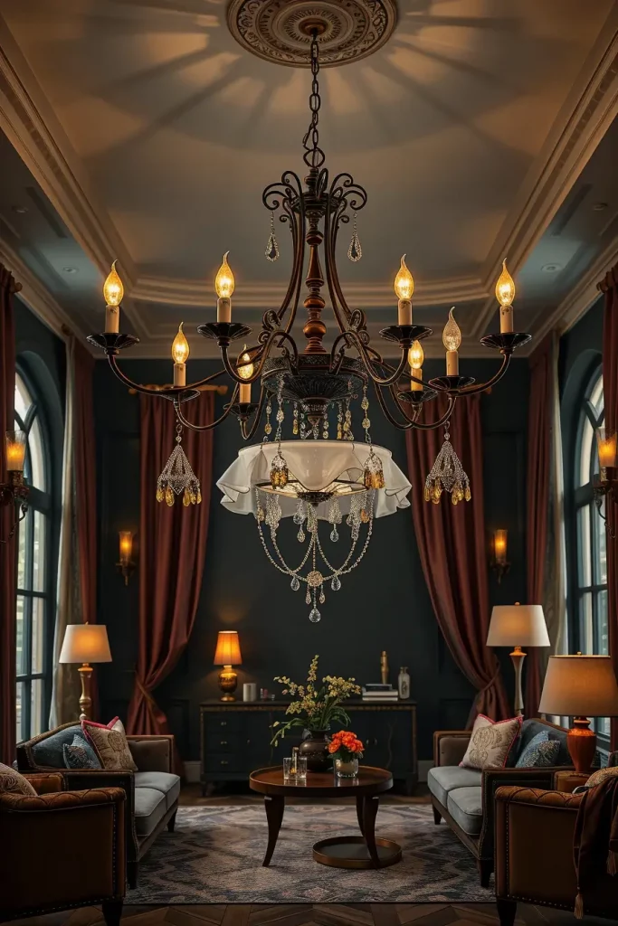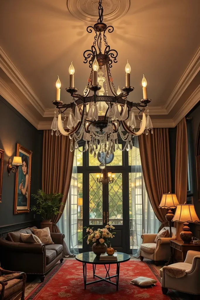 The next of the daring updates I suggest to your Halloween living room decor ideas 2025 is to alter your illumination. Lighting dictates the entire room’s mood, and nothing delivers more dramatic flair than a gothic-inspired chandelier. I prefer wrought iron fixtures that have arched arms and candle-like bulbs in my designs. These make the room feel like an old world library or a haunted manor especially when used with dark paint and textured fabrics.