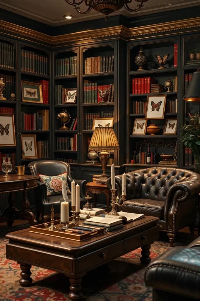 I always begin with a big bookcase or built-in shelves, which I decorate with old books, candleholders, and old scrolls. The space is set by a tufted leather armchair, a brass desk lamp and a dark walnut coffee table. I supplement with decor such as hourglasses, quill pens and framed butterflies to tell stories. The colors used are deep green, wine red, black and gold, and the candlelight is used to bring out the textures.