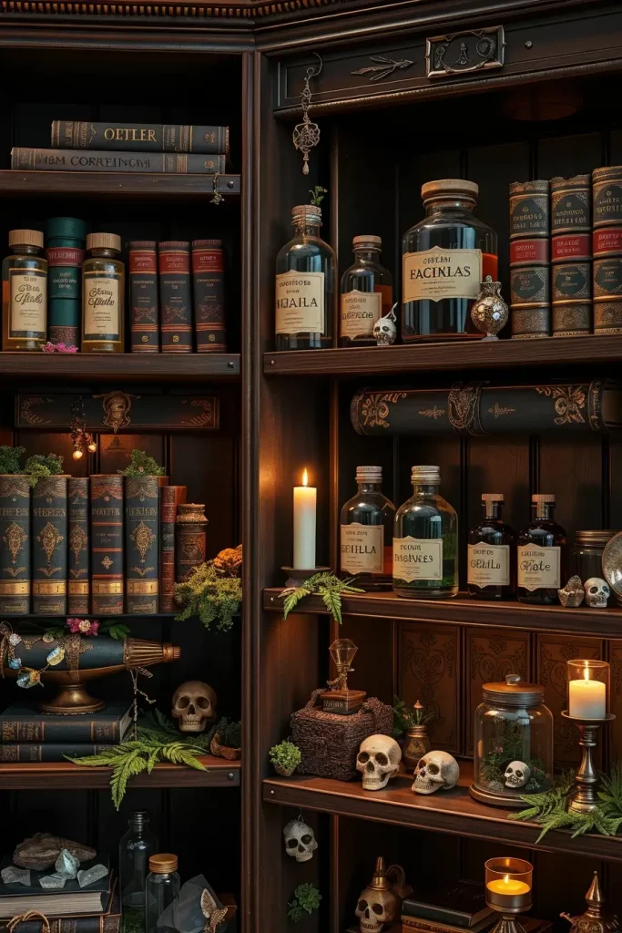 It is not only fun to turn your bookshelf into a witch apothecary, but it is also very effective decoration during Halloween. I customize my own bookcases by adding labeled potion bottles, stacked spellbooks and magical artifacts that will cause curiosity. This is an excellent method because it does not eliminate the functionality of your space but adds elements of themed decor.