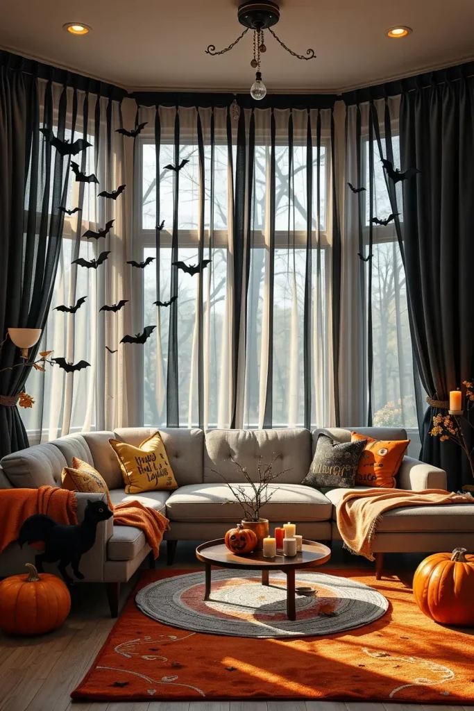 I prefer heavyweight materials such as velvet or suede in deep purple, black, or burnt orange. These are a visual and practical pick-me-up–bringing in a bit of coziness as fall creeps in. Darker curtain swaps add drama to the space without overpowering the design, in case the space features neutral furniture. I have also had marvellous effects by means of sheer overlays which admit daylight to play through skull or bat patterns, and create a shifting play of light during the day.