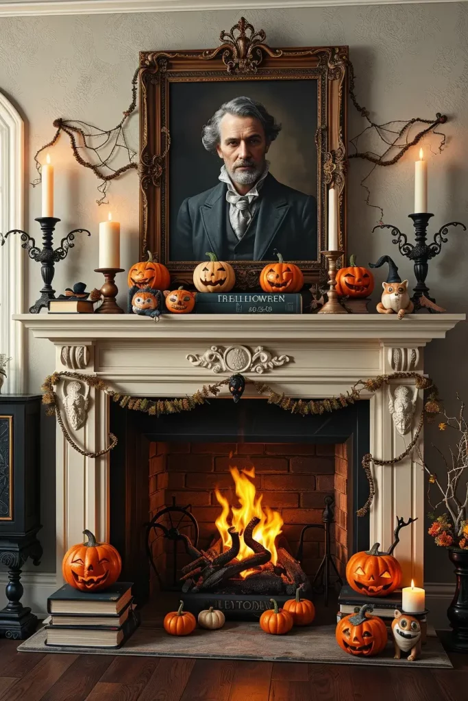 Halloween is also the best time to decorate the mantel with a spooky touch in case you are lucky enough to have a fireplace in your living room. Personally, I find that it is the center of the room, so it is worth paying more attention to it. Accent and clear or iridescent accessories will make the ghostly, ethereal effect.