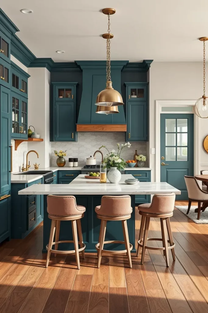 A Deep Teal kitchen is both a bold statement and an assertion. I am always drawn towards its deep colour that combines blue and green to create a memorable colour. This color suits open plans that have a lot of natural light. I would mix Deep Teal cabinetry and Brass Gold hardware and Melodious Ivory or Creamy White countertops to create a gorgeous contrast.