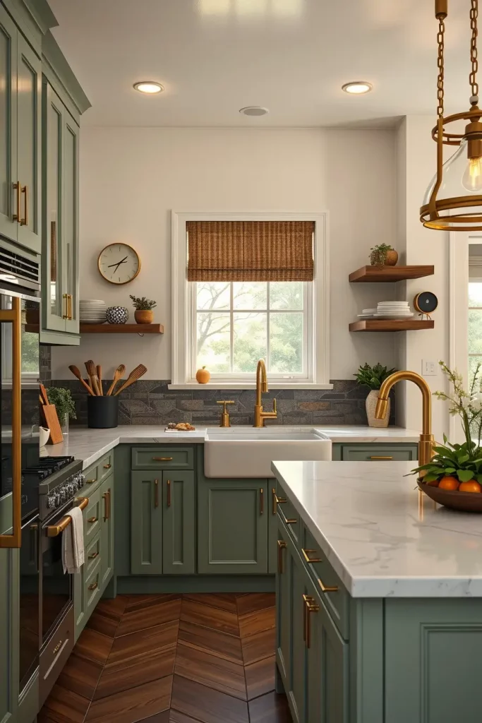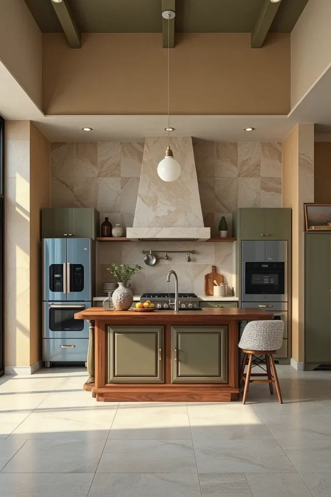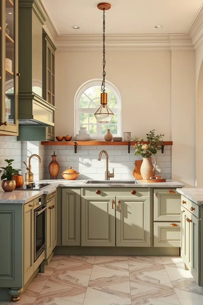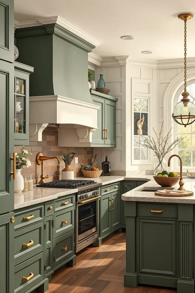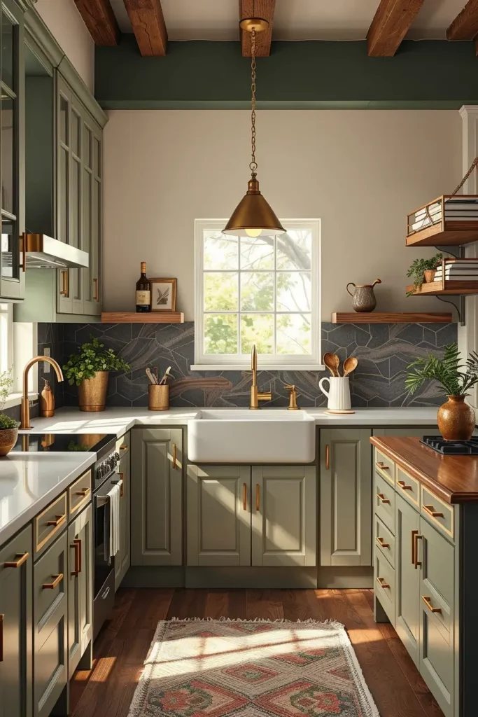 Muted Olive and Brushed Steel Blue appliances or Rusty Copper fixtures are good companions to Cabinets. To add a high note, I prefer using trims or island bases made of Walnut Wood that will add to the ground-like tones. The light is soft which helps to underline the minor changes in the hue, making the kitchen a comfortable but high-end atmosphere.