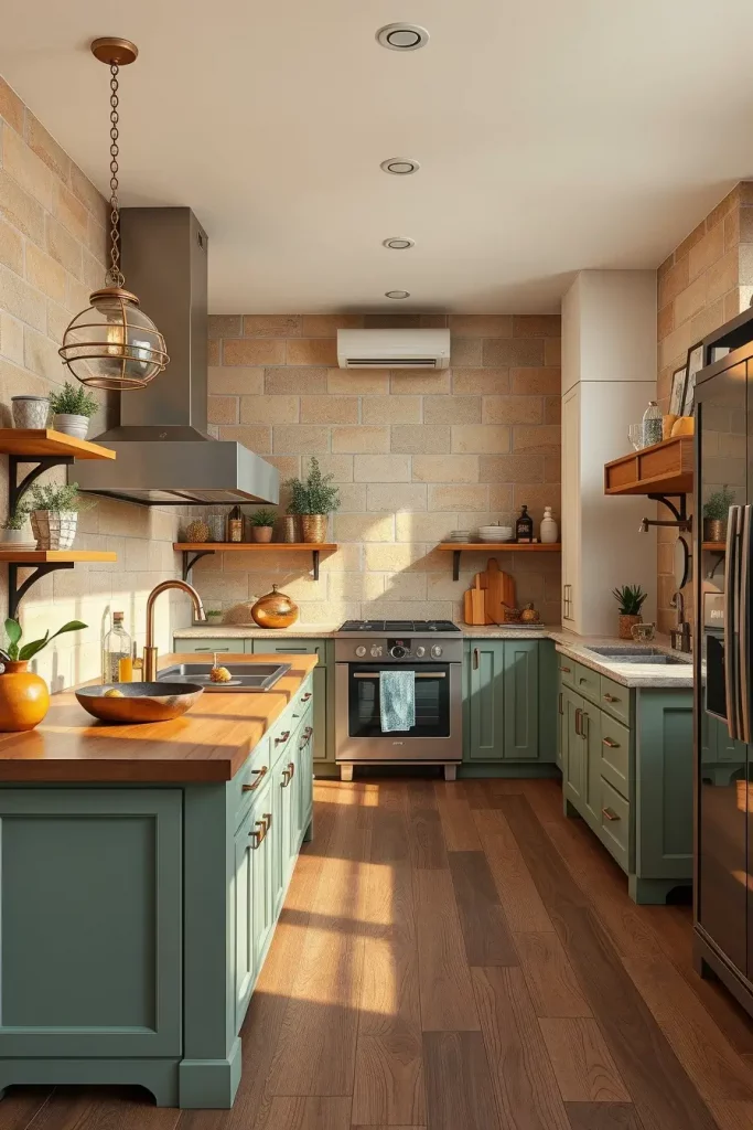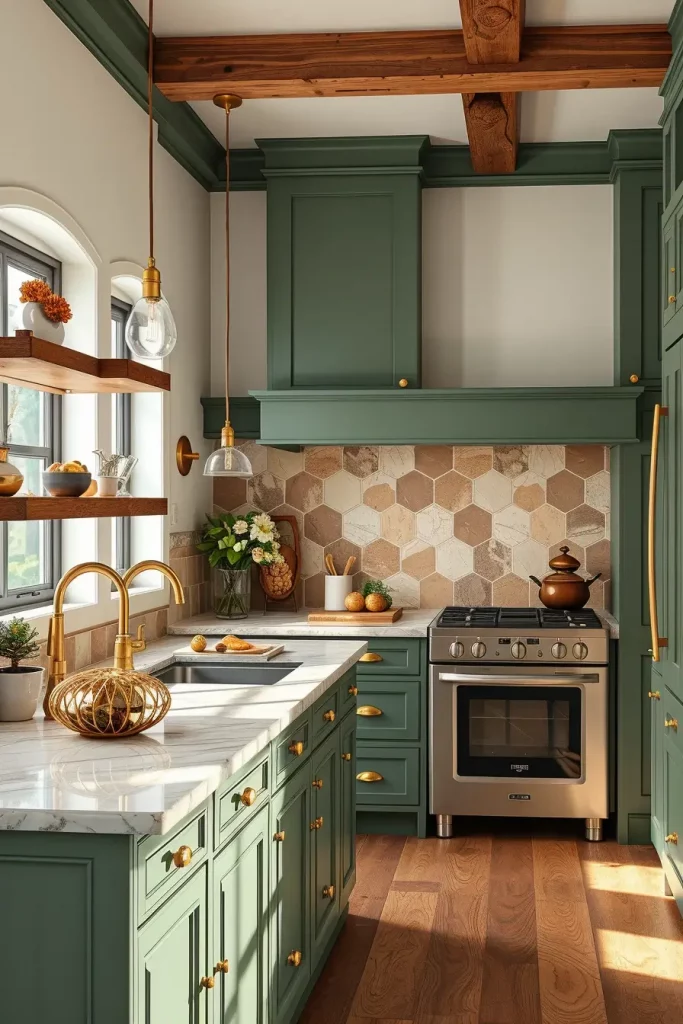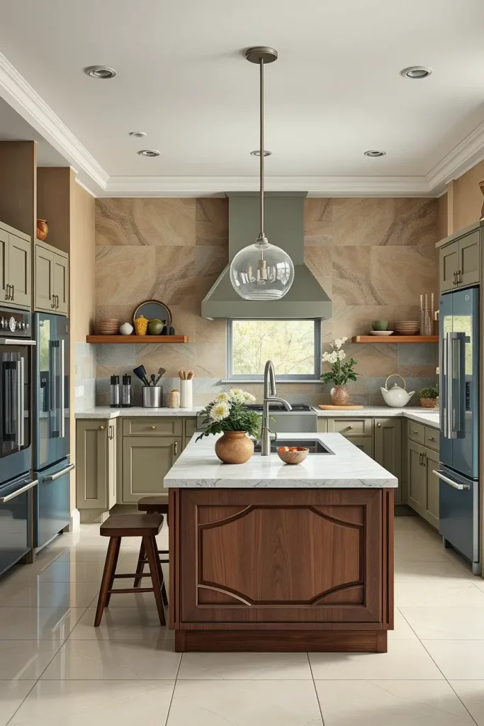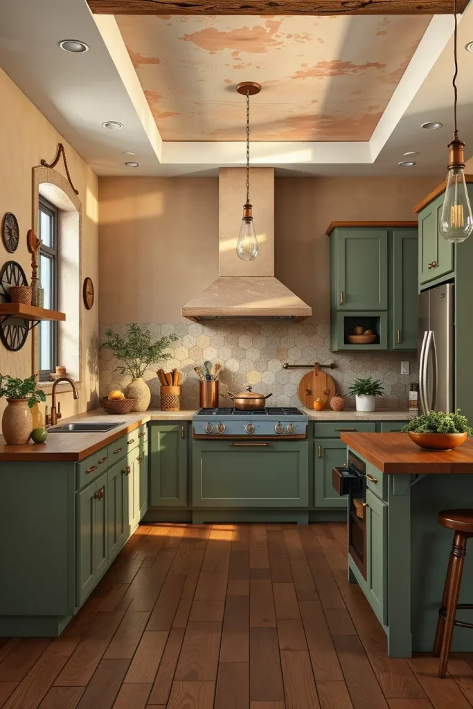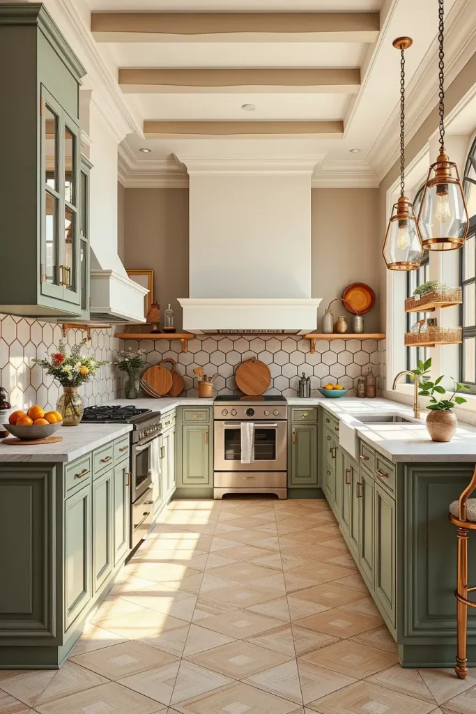 Muted Olive and Brushed Steel Blue appliances or Rusty Copper fixtures are good companions to Cabinets. To add a high note, I prefer using trims or island bases made of Walnut Wood that will add to the ground-like tones. The light is soft which helps to underline the minor changes in the hue, making the kitchen a comfortable but high-end atmosphere.