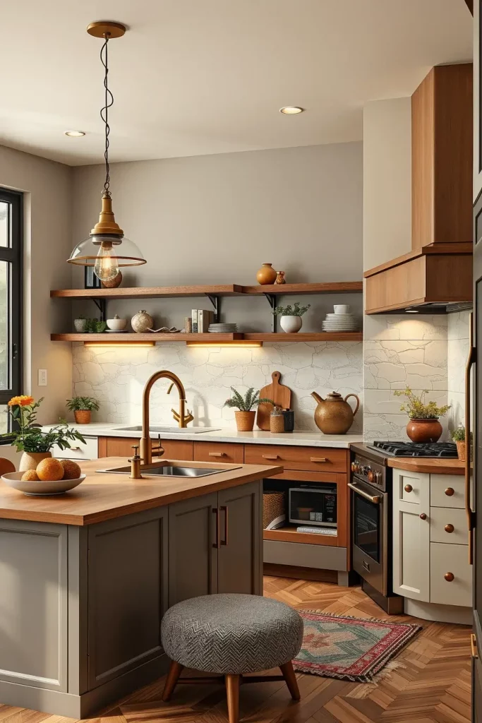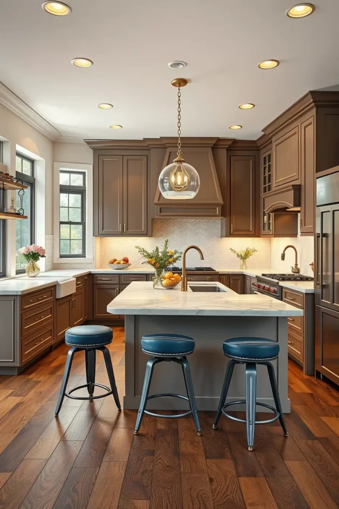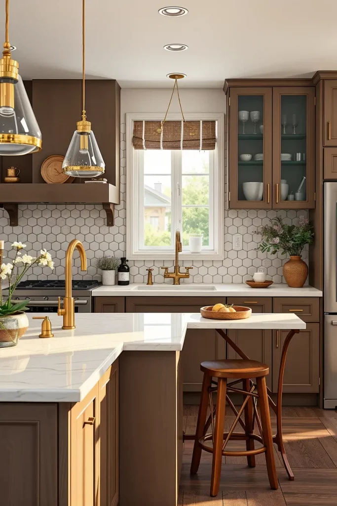 These kitchens have smooth Shelving with Walnut Wood and dark marble countertops which I usually add contrast to. Sandstone Beige backsplash is used to add the natural coziness of Mushroom Taupe, with a touch of the upscale Brass Gold pendant lighting. These little elements form a unified and classic appearance which is both luxurious and personal.