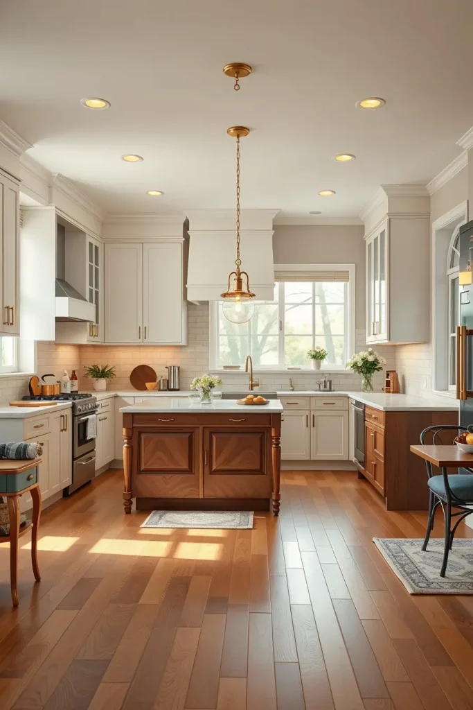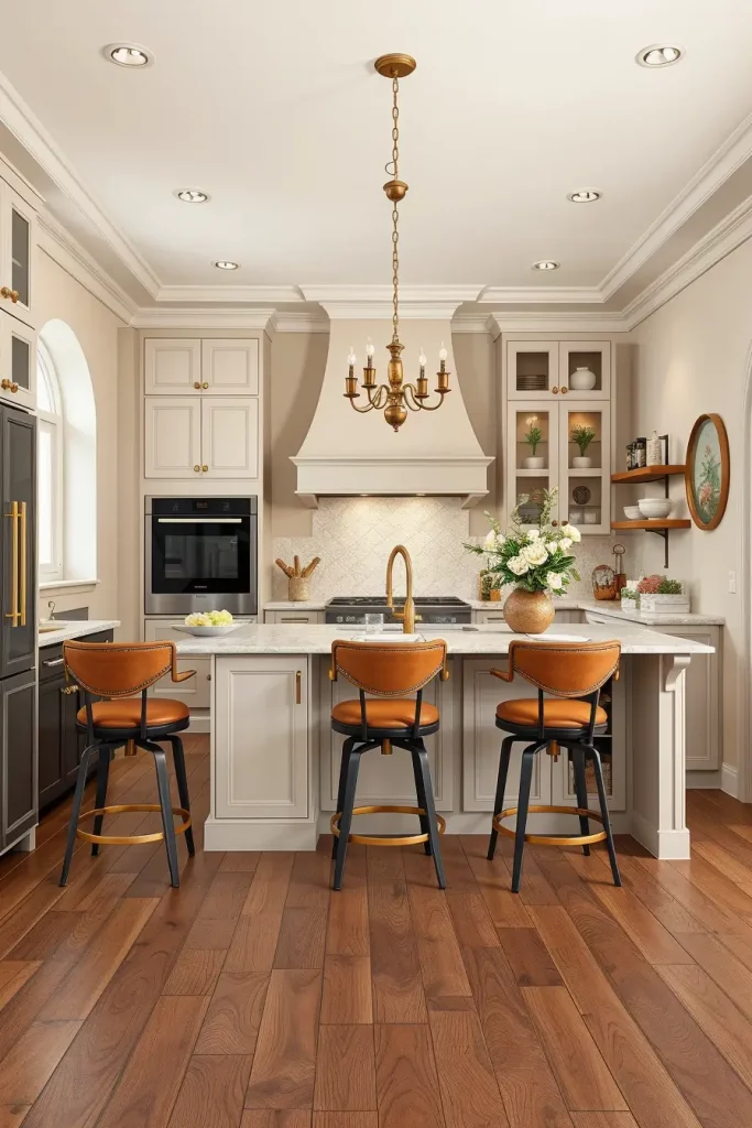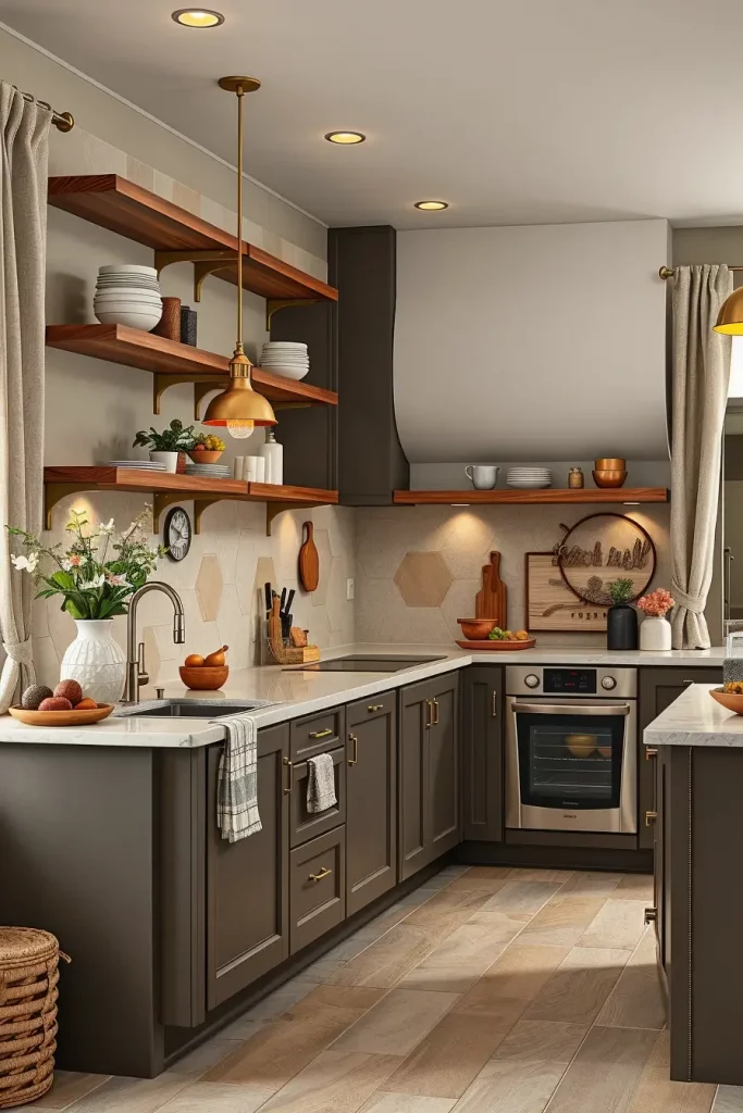 Honey Oat Cabinetry, Mushroom Taupe on the walls and Walnut Wood flooring are some of the examples of combinations I normally suggest. Add Brass Gold is used in the hand, Creamy White counter tops, and soft Latte Brown textiles to make it a whole design. The outcome seems inherently stratified and classic.
