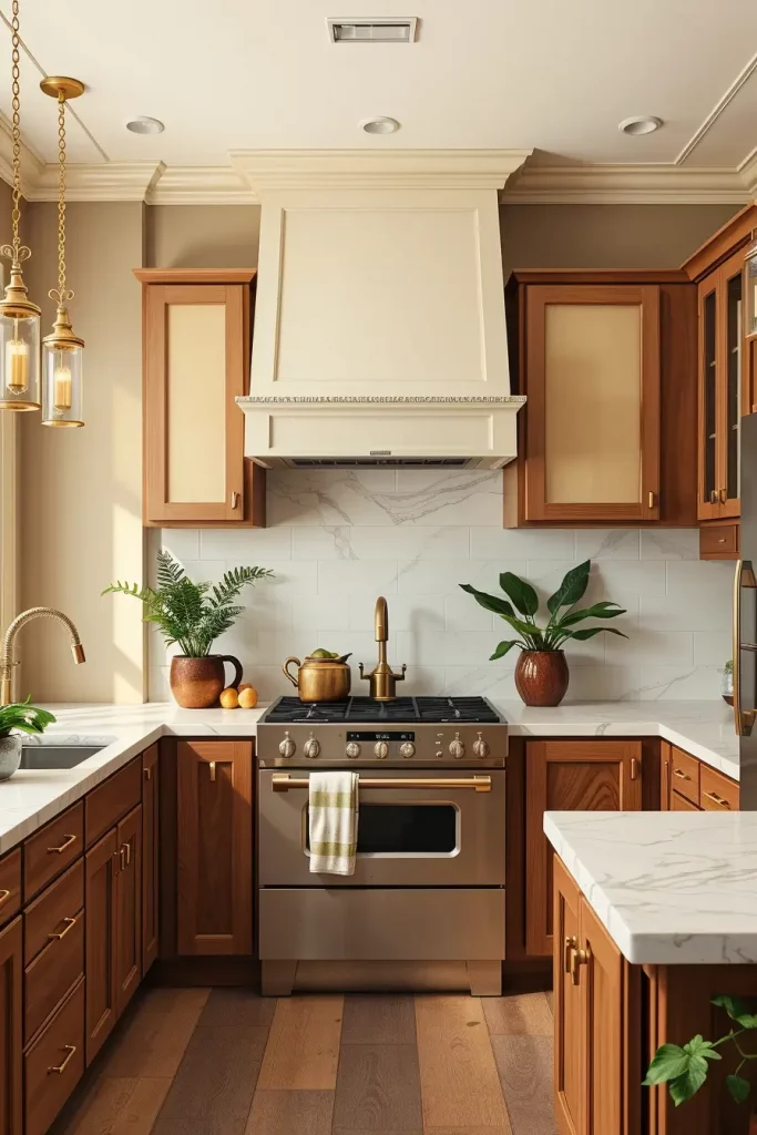 To update it to 2026, I prefer to combine Walnut Wood cabinetry with Brass Gold door handles, Latte Brown tiles, and Melodious Ivory countertop. Such combinations add organic beauty to the area and make it practical and easy to maintain. The arrangement is modernized using a few Pewter Metallic pendant lights.