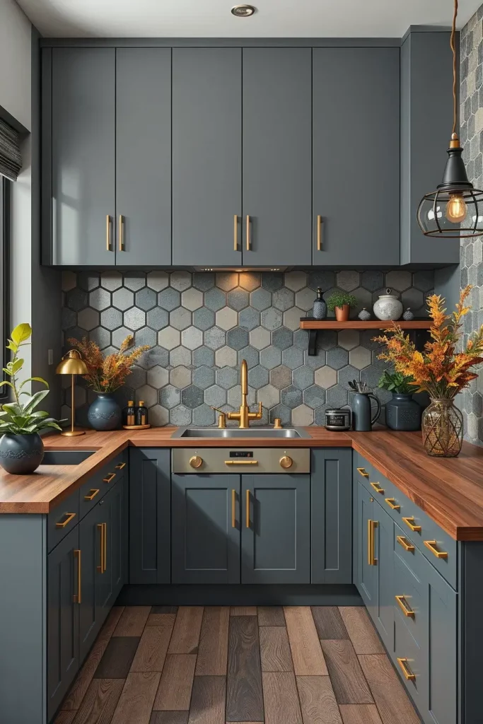 As materials, it is quite common to use a mixture of Steel Blue cabinets with Melodious Ivory countertops and Brass Gold fixtures. Walnut Wood floors or open shelves add to the warm and comfortable feel of the place. The lighting is minimalist Pewter Metallic that assists in uniting the space with a slight yet bright lustre.