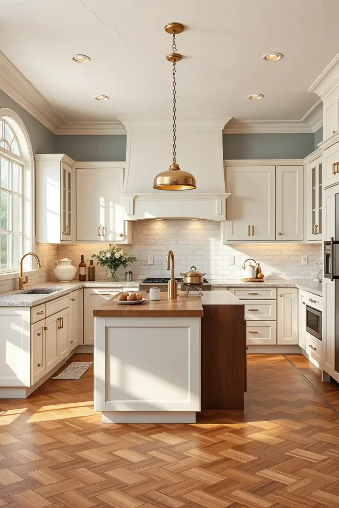 I would suggest Soft Peach to be used on the walls or rather as an accent on the island. Incorporate Creamy White cabinetry and Brass Gold fixtures to have a balanced and fancy design. Walnut Wood flooring or Honey Oat details bring down the palette keeping its light warmness.