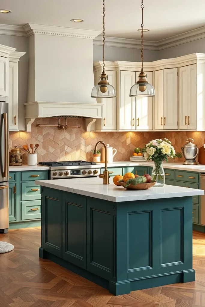 In 2026, two-tone kitchens are transforming balance and creativity. I have observed that designers are not idea on high-contrast colors but are instead using more subtle transitions between colors. I prefer Sage Green behind cabinets and Creamy White on top, or Deep Teal matched with Melodious Ivory to make the place seem fresh and elegant at the same time.