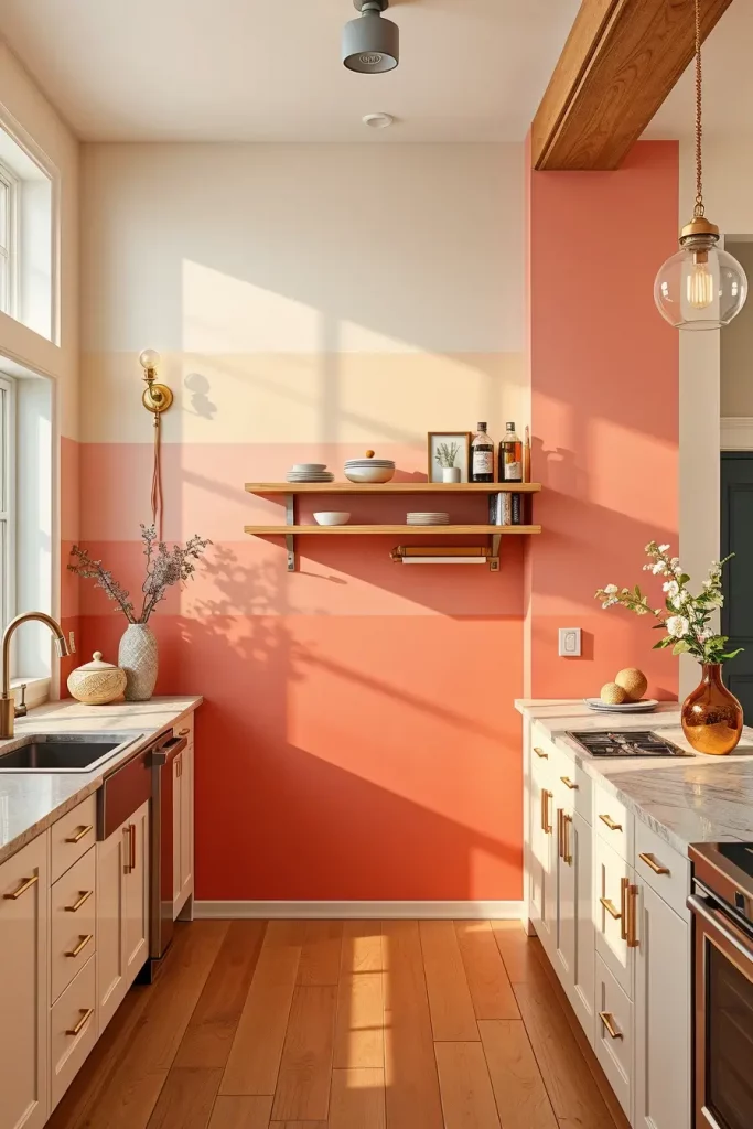 No other way better represents the colors of a sunset than a wonderful ombre wall. Using colors like deep coral, soft apricot, and warm gold make the look more beautiful and give a true wow effect. It looks best in kitchens where a single wall is not included in the layout.
