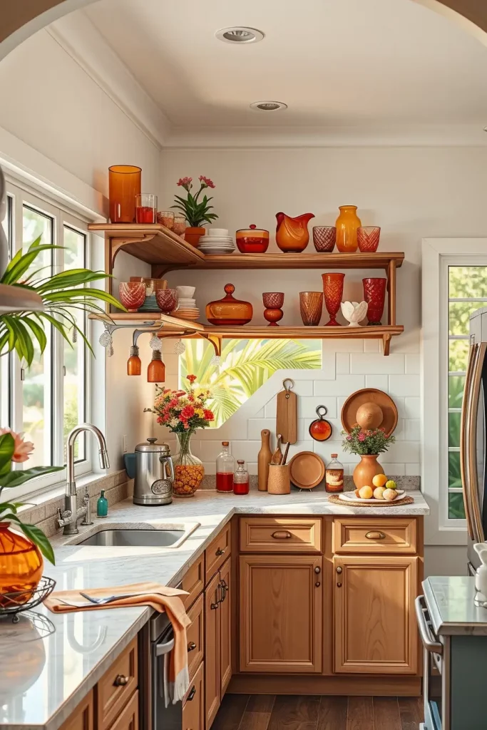 Try to put these shelves up against a textured or patterned backsplash, because it will enhance the appearance of the paprika tone. Displaying a bright citrus artwork somewhere in the area is also a good idea.