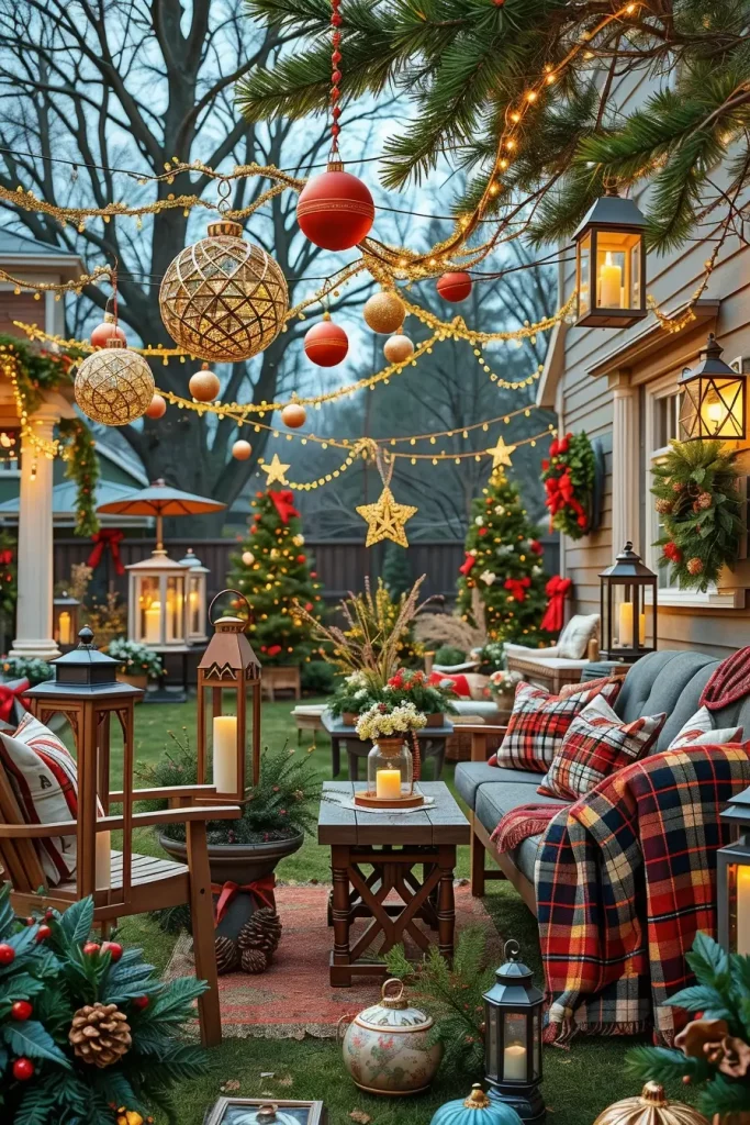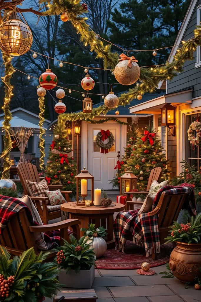 I would also incorporate the use of LED-lit garlands, oversized baubles and wooden decorations that would make it warm and cozy. Plaid blankets or faux fur cushions can be used to decorate outdoor furniture to represent the festive atmosphere extending to sitting areas. The decorations are more practical with these touches, and the guests can comfortably spend some time in the yard even during the colder seasons.