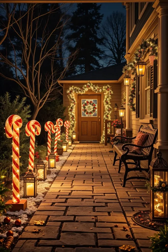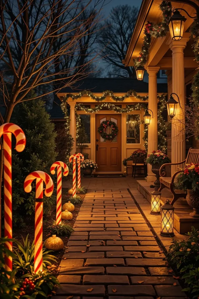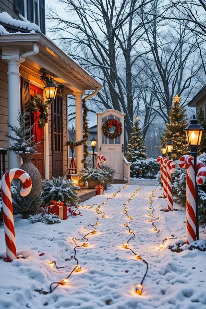 I would like to use long-lasting LED candy cane lights, which can stand the weather conditions and at the same time shine brightly. Placing them in equal amounts all through the route, intertwining with red and white patterns or even altering light patterns are all playful. It is more complete when they are paired with artificial snow blankets or light-up ornaments.