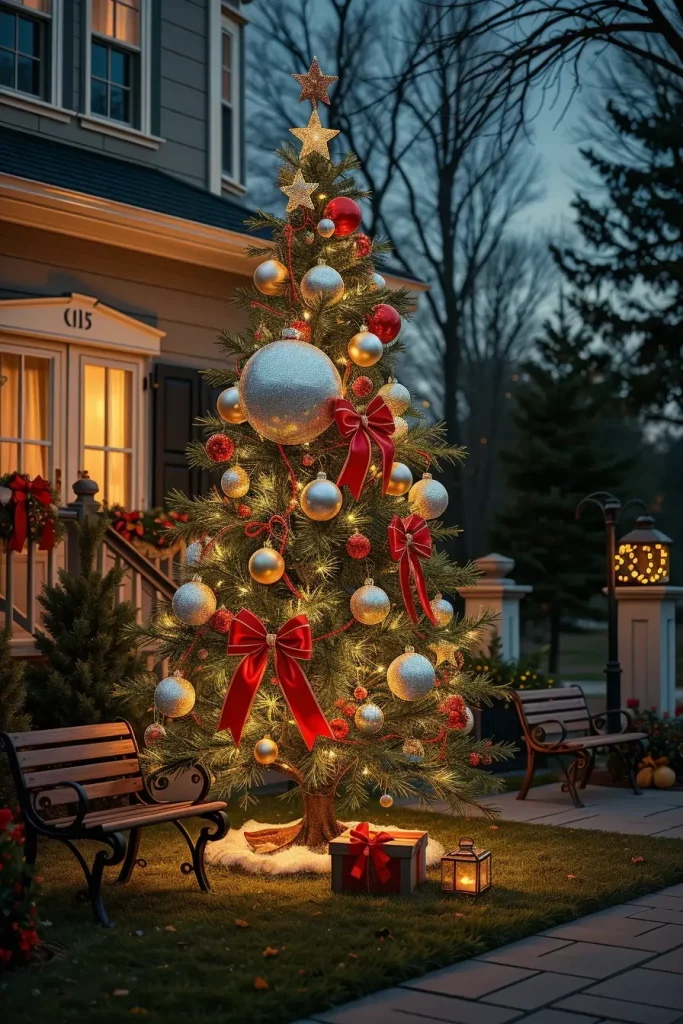 To achieve maximum impact, I will use large sized ornamentation, ribbons and tough lights that are used outdoors. It can be enhanced with a tree skirt or small benches so that it could form an intimate, purposeful picture. These touches make a plain tree a complete outdoors design feature.