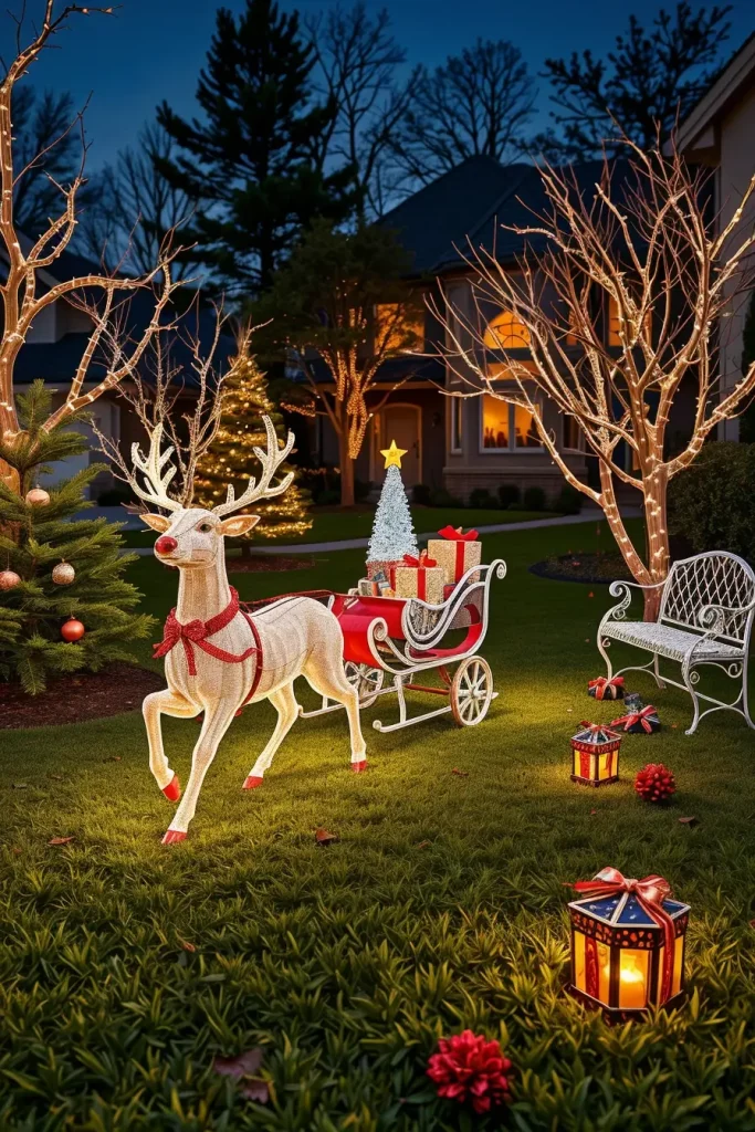 I prefer to have a sleigh in the middle of the yard, the reindeer placed in an undress line forward. In order to get the display together I tend to add few decorative items such as gift boxes wrapped in waterproof material or set up of trees with lights to frame the display. There is an outdoor piece of furniture in the form of a bench which makes the implementation look like a holiday staging shot.