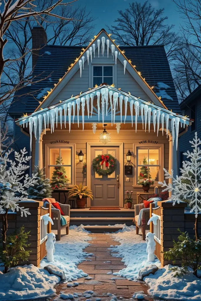 Icicle lights can turn it into a winter wonderland of any house. I usually tie them onto rooflines, porches, and even fences so as to create the effect of glittering ice. The cascading effect is festive in nature, and it immediately gives depth to the whole design of the holiday.