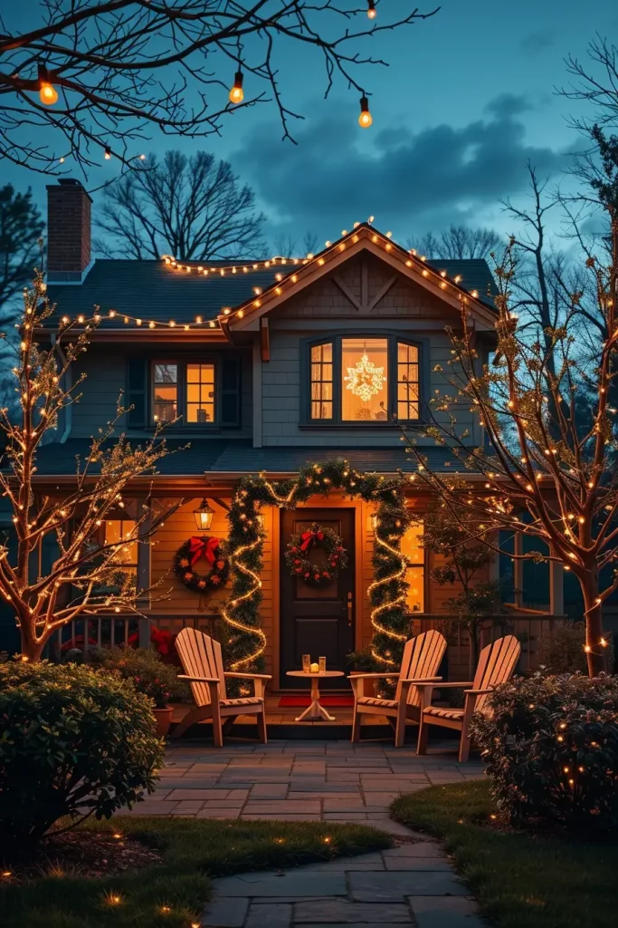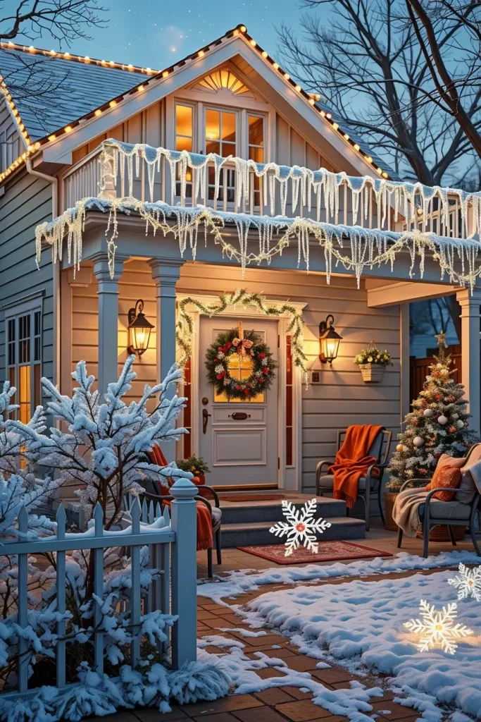 I prefer combining the old fashioned white icicle lights with some little blue light as part of the frosty look. Their combination with other outdoor Christmas decorations such as wreaths or light-up snowflakes helps to make the appearance unified. To tone down the impression, I occasionally include outdoor furniture with warm blankets in the area, which makes the yard cozy despite the theme of icy weather.