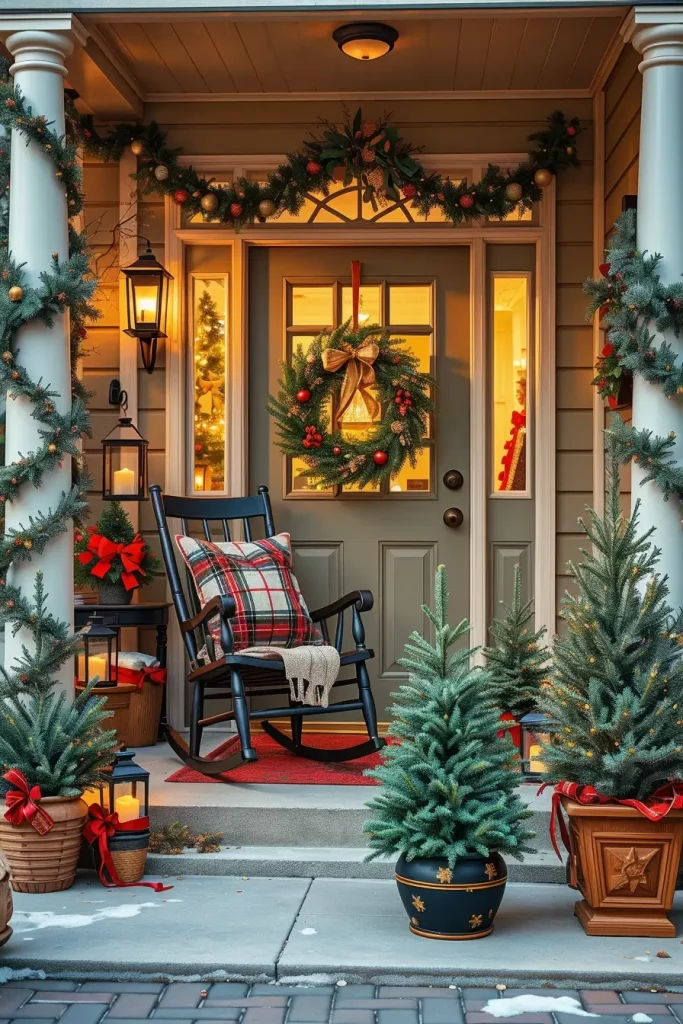 My style is to put garlands around the railing, and lights inside the frame of the door, as well as a large wreath in the middle. Plaid pillows or knitted throws can be used as accessories to outdoor furniture like a rocking chair or small bench. These minor details make the indoors outdoorsly.