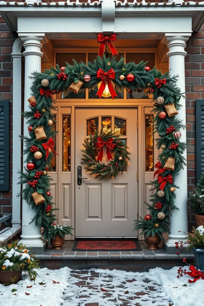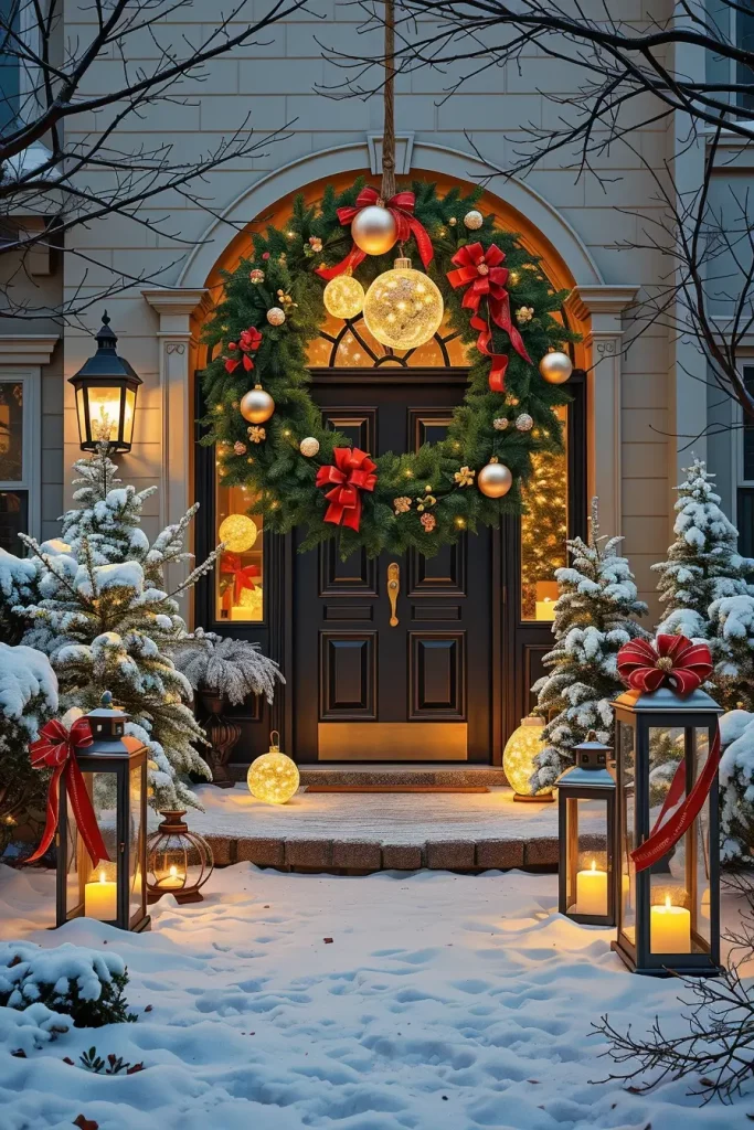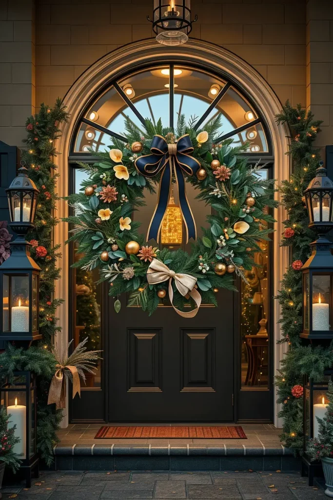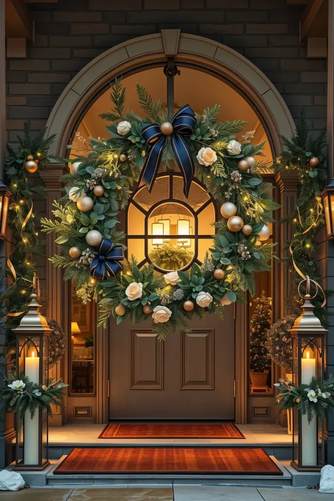 I would like to add such details as ribbon bows, berries, and even small LED lights tied into the wreath to make it sparkle. These may be combined with the outdoor lanterns or similar garlands on the entrance to provide a harmonious appearance. The presentation is not only improved by furniture such as a small entry table with holiday accents around it.