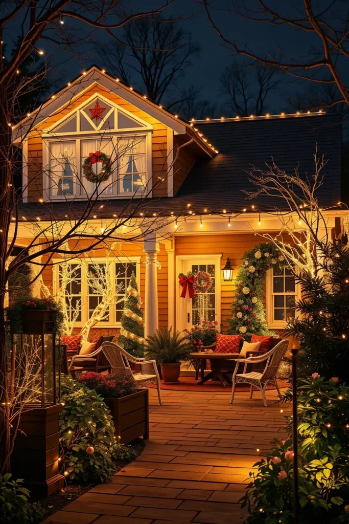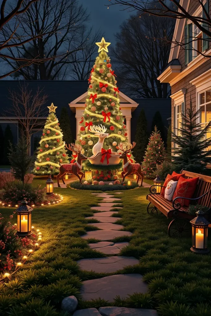 I tend to suggest a layer on the lawn, a couple of large ornaments, some garlands on the fence, and an eye-catching light-up display, such as a sleigh of Santa. Furniture may be included like a garden bench with pillows and lanterns to bring coziness. The information makes the yard look like it is celebratory but welcoming.