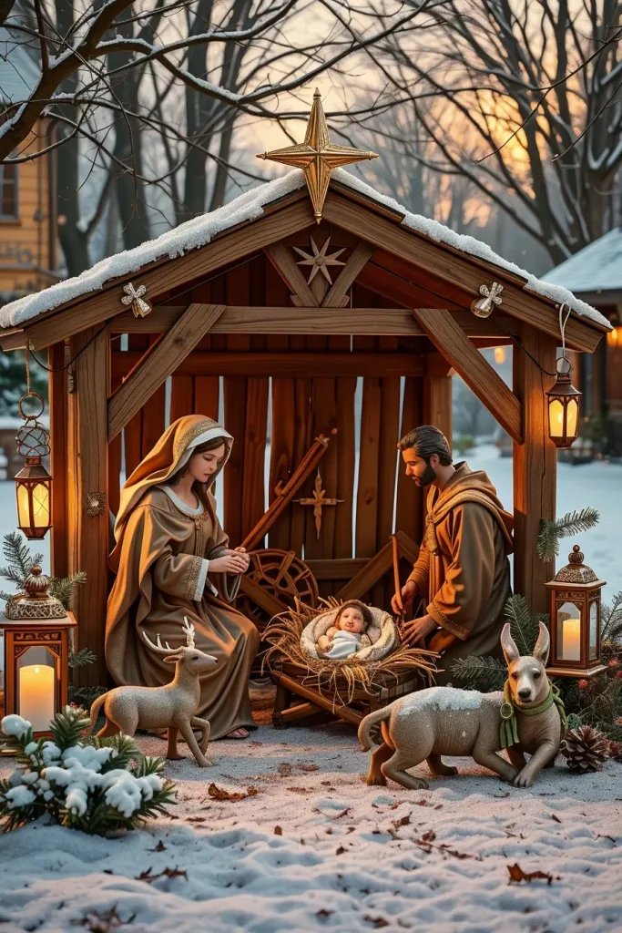 The nativity set may be as plain as the wooden cutouts or highly detailed figurines. Personally, I like weather-resistant resin or polyresin figures since they support the snow and rain and do not lose their appeal. The authenticity is enhanced by the use of straw bedding, a wooden stable and gentle use of golden lighting.
