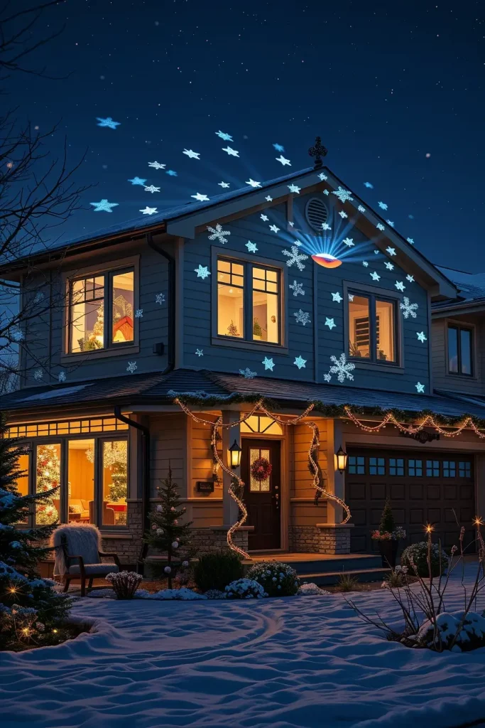 I tend to locate a projector at a very slight angle with the house facade. The use of waterproof models is a way of making sure that it is reliable even during snow. They go hand in hand with plain string lights since they offer them a background effect and the lights bring texture and depth.