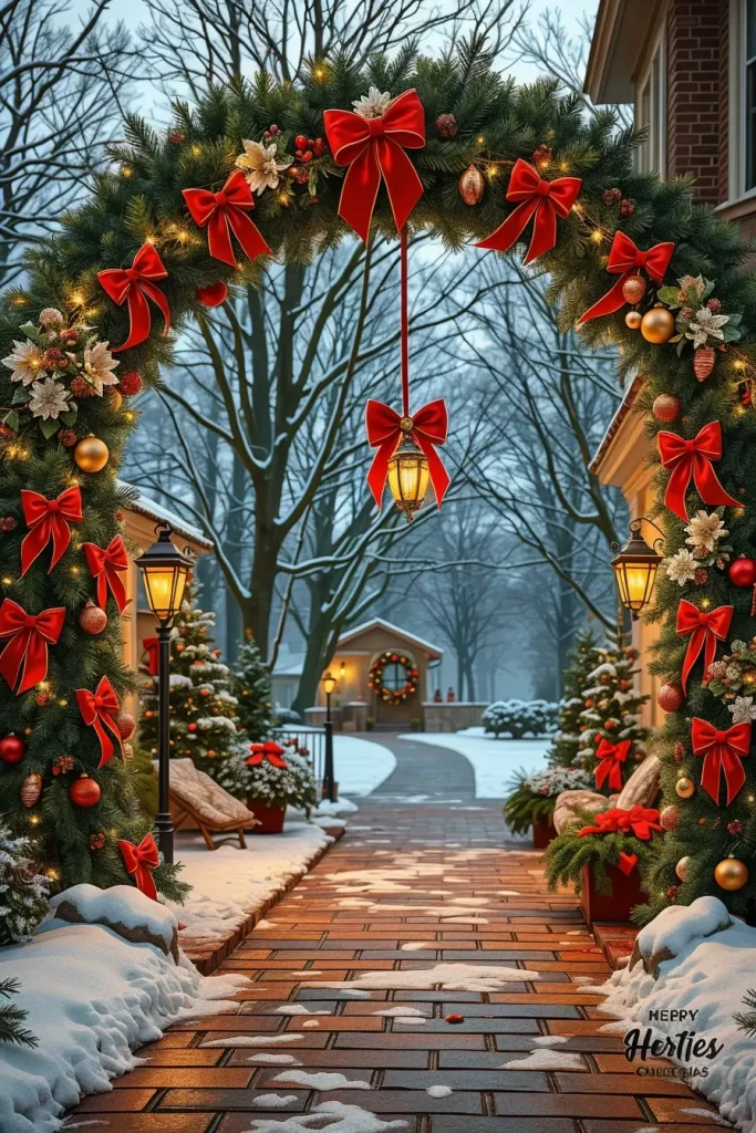 In installing such an entrance, I tend to use arches that are enclosed with white lights or golden lights, and I will tend to include garlands of evergreen, ribbons, and metallic ornaments. One of the paths is surrounded with lit arches that make it immersive and make visitors feel that they are entering a carnival wonderland. I suggest putting them in well-grounded or rather cemented, particularly when there is some windy weather and with some similar outdoor Christmas decorations such as ground stakes or lanterns.