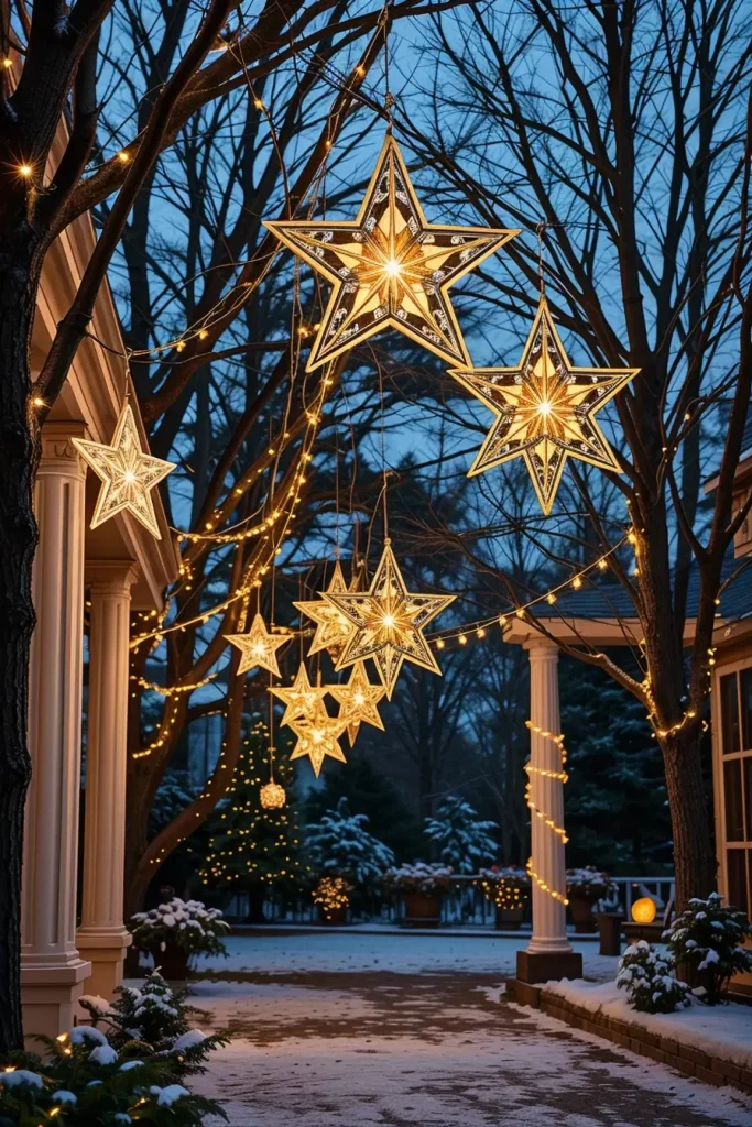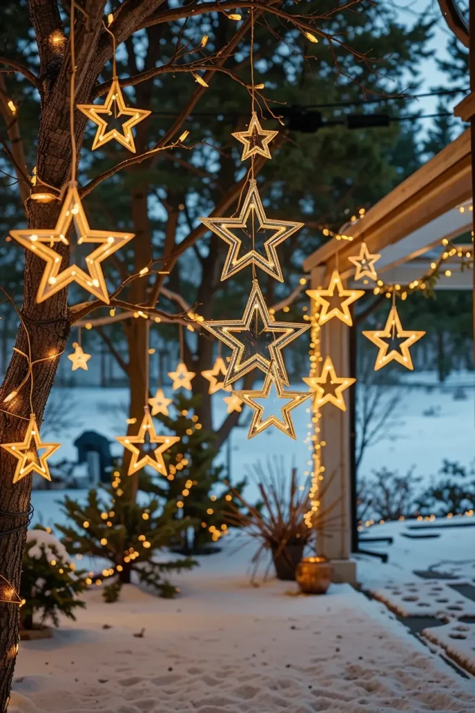 Something magical is putting lights of hanging stars across an outdoor area. I like to hang them between trees, beam of a porch or pergolas to make the illusion of a starry sky in my home yard. They immediately switch the atmosphere of the average holiday decor to something more dreamy and mysterious.
