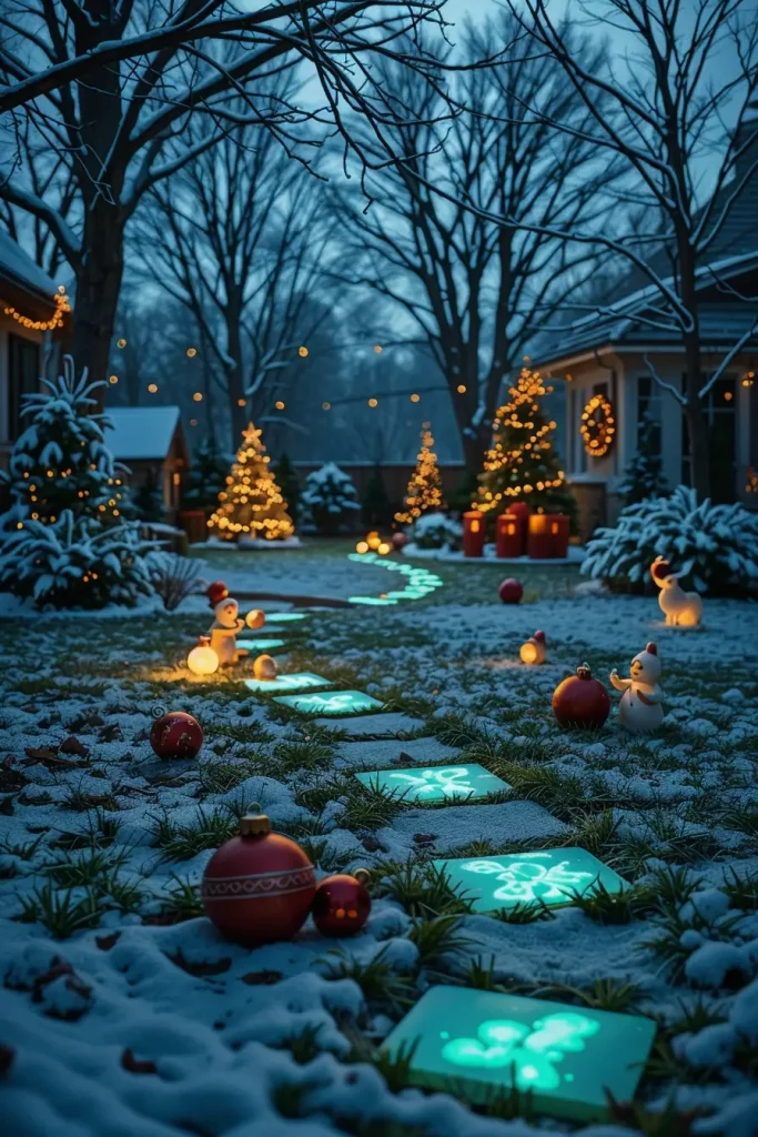 I tend to add thematic pathway lights, such as candy canes or snow, to thematically include them in the general design of the holiday. They are compatible with fences or porch railing garlands. These lights can be used to add more festive details even to simple benches or planters that are located along the way.