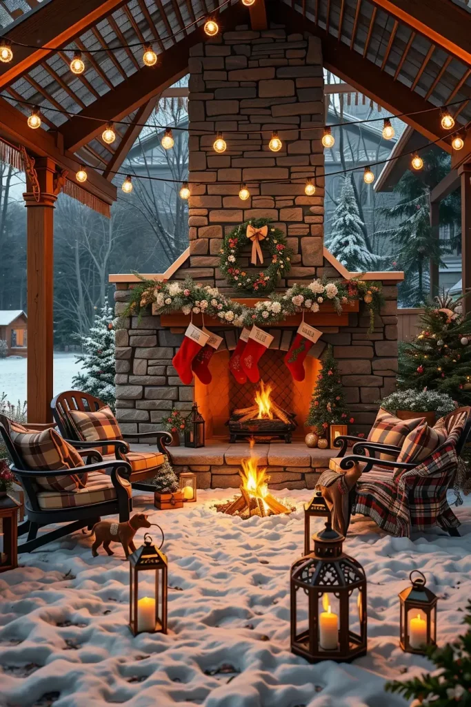 In the arrangement of such a system I normally make the fire place the centre of a sitting section and decorate it with wreaths, stockings, or lanterns. The space is welcoming with comfortable chairs/benches that have plaid cushions. I tend to incorporate firewood baskets and small side tables on which to place drinks so that the space appears stylish and functional at the same time. Outdoor safe electric or gas fireplaces allow one to achieve the same effect without fearing smoke or sparks.