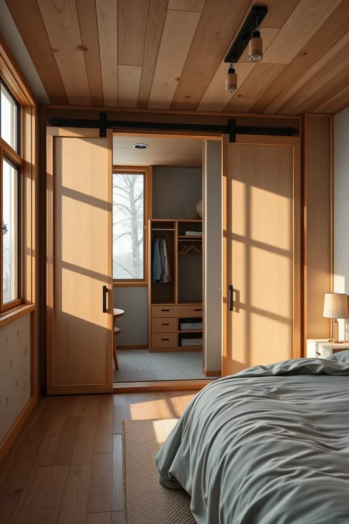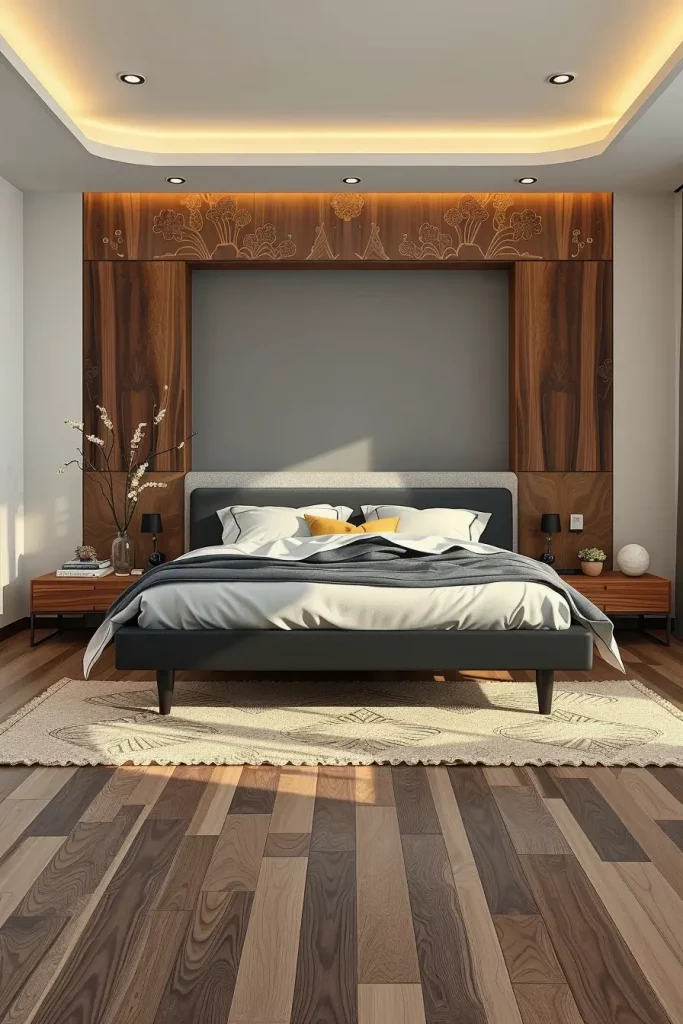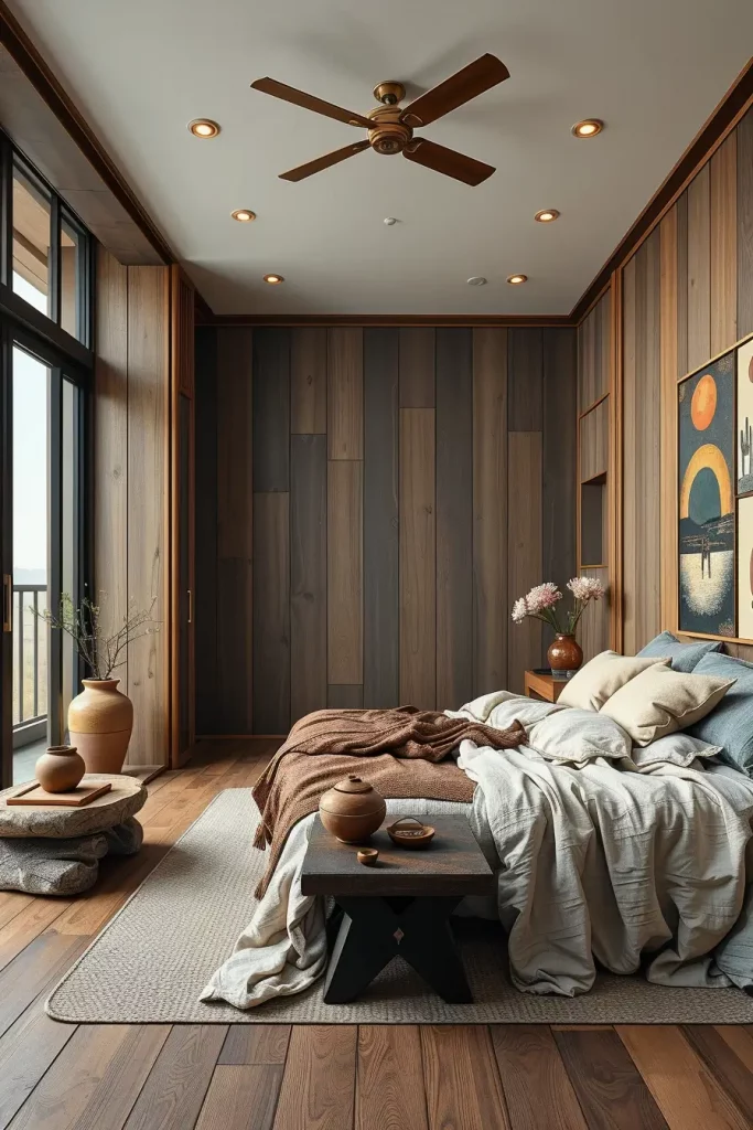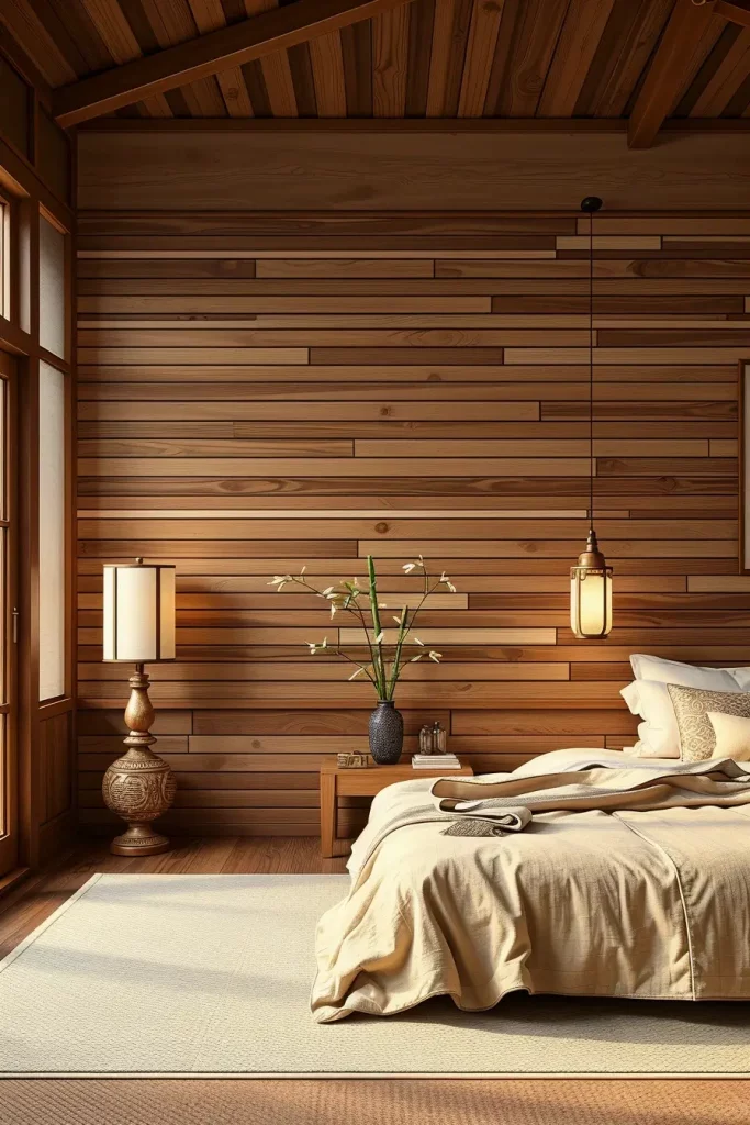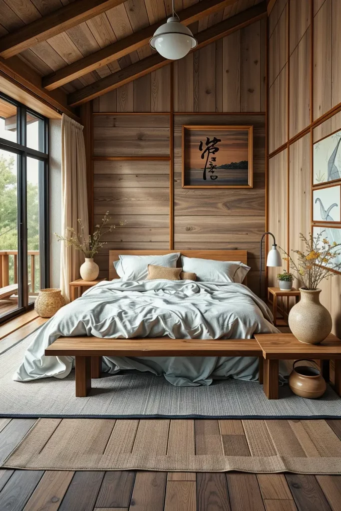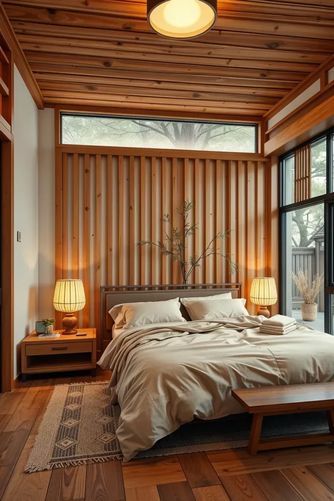 Incorporating natural wood in a Japanese bedroom is more than an aesthetic choice — it’s an emotional one. Whether it’s oak, hinoki, or bamboo, these materials bring tactile warmth and a sensory connection to nature. In it, all the surfaces, including the bed frame, slatted walls, side tables are made of untreated or lightly oiled wood.
