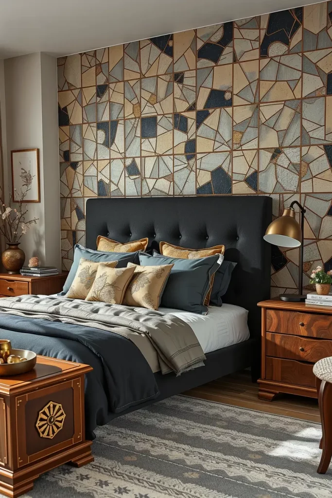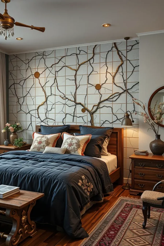It has a non-competitive contrast, such as the soft charcoal bedding, the matte ceramic lamp and a side table with wood knots showing. Instead of being a loud centerpieces the Kintsugi references come in rather quiet gestures. This allows them to be unobtrusive as the emotional epicentre of the room.