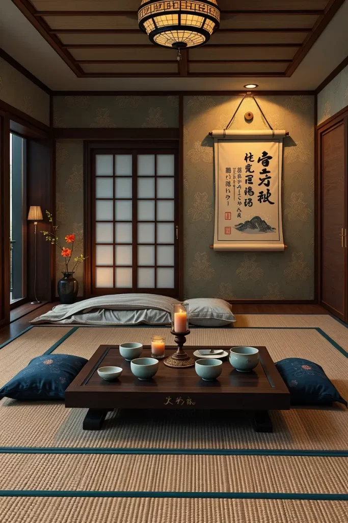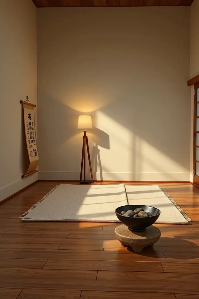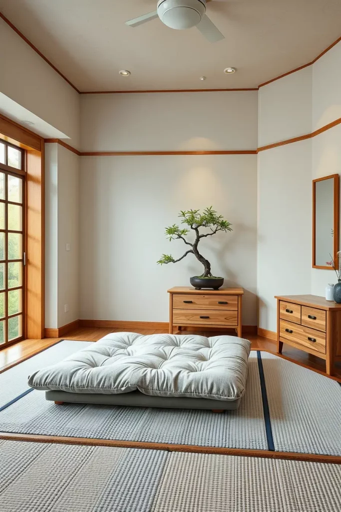 I put in natural-fibered fabrics such as linen or cotton gauze that ring out the Japanese simplicity. Neutral colors like light greys, husky beiges or soft whites are the best. Adding accent pillows in low key geometry or soft pastel colors to inject a tease of creativity without disturbing the rooms serenity is also what I do.