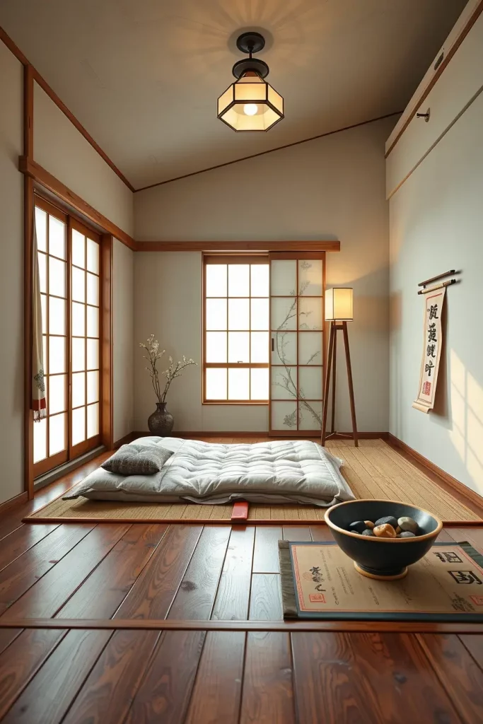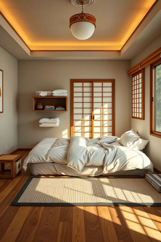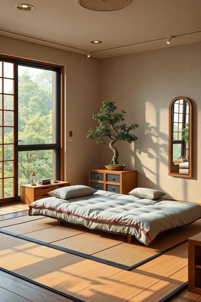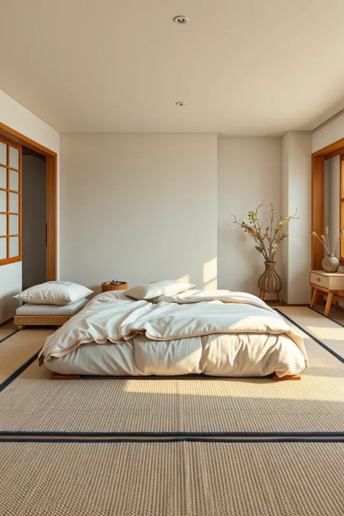 A standard fertilizer mattress: not the heavy Western mattress, but the traditional folding kind, permits such suppleness of application. It can be placed directly on the paddings of tatami or on wooden floors, which makes it close to the floor and it subsequently enhances peaceful and meditative sleep. I love that it can be packed away so easily making the room available during the day time.