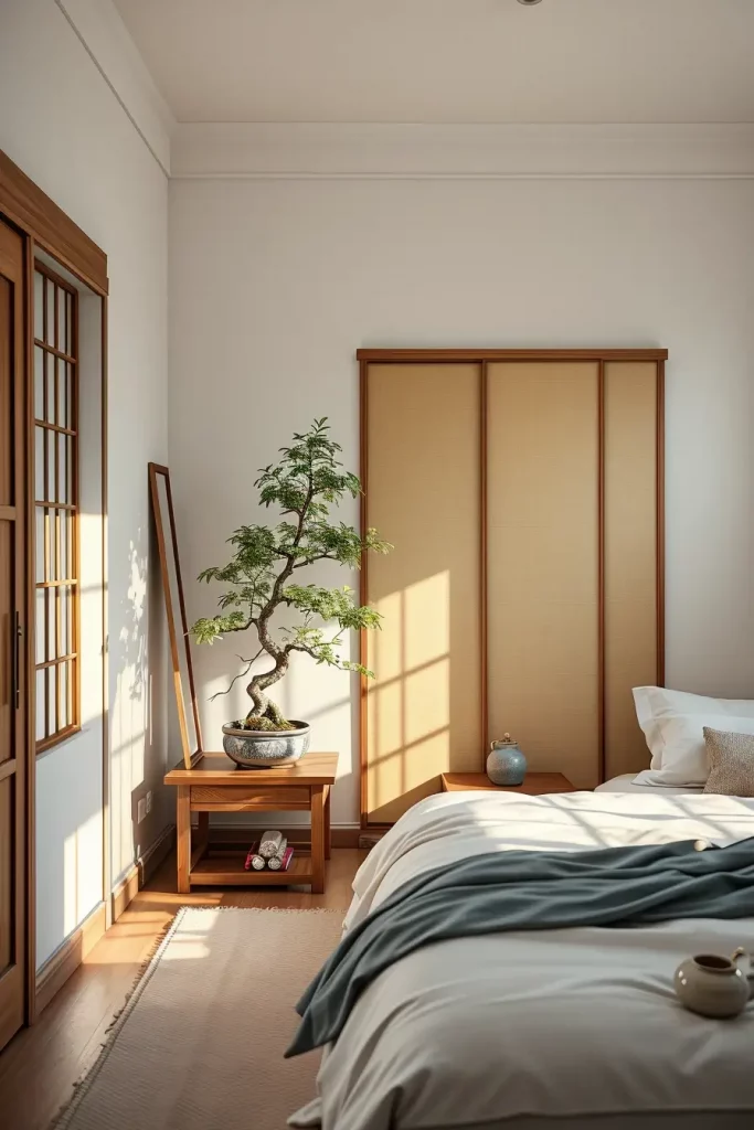 There is no better way to add some life to Zen-inspired bedroom than with a purpose—and bonsai trees make a perfect symbolic and aesthetic marker. It is not uncommon to put a bonsai on a wooden shelf above a level or in a niche on the wall where it becomes a sculpture in nature. It introduces an element of seasonal offering, contemplative gaze and peaceful rhythm into the premises.