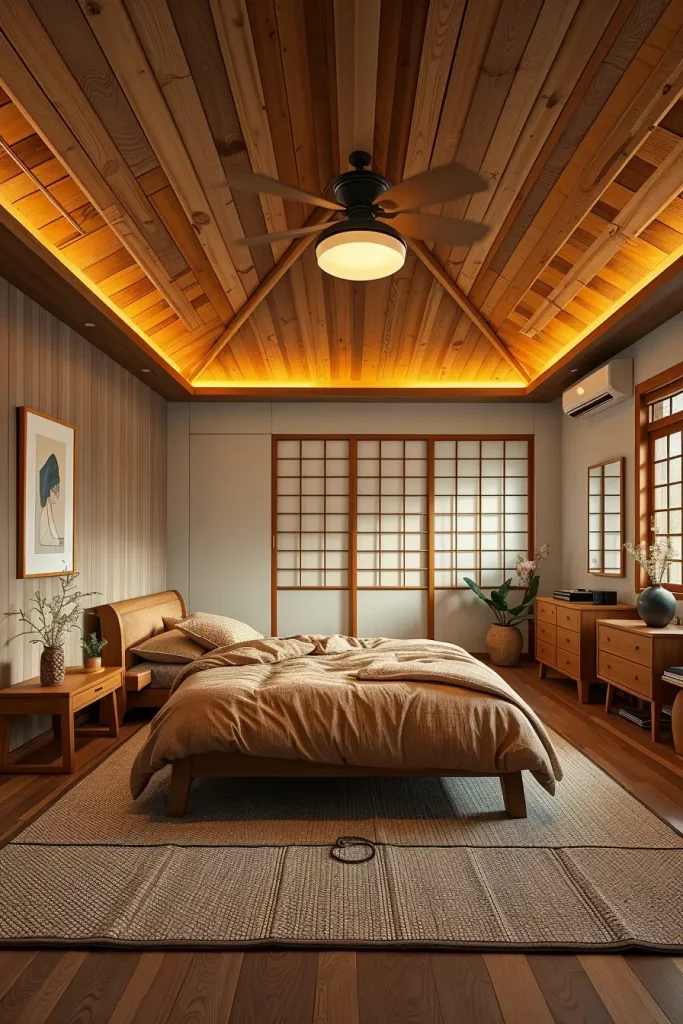 Under design considerations, this top feature blurs the high spaces and brings about a comforting coziness. I got the idea of a Kyoto ryokan hotel room, the room in which I stayed once and I liked the wooden feeling of the ceiling which visually covered the whole area. Elle Decor says that most of the minimalist bedrooms are also given visual structure and warmth by such ceilings- a fact that I am living by.